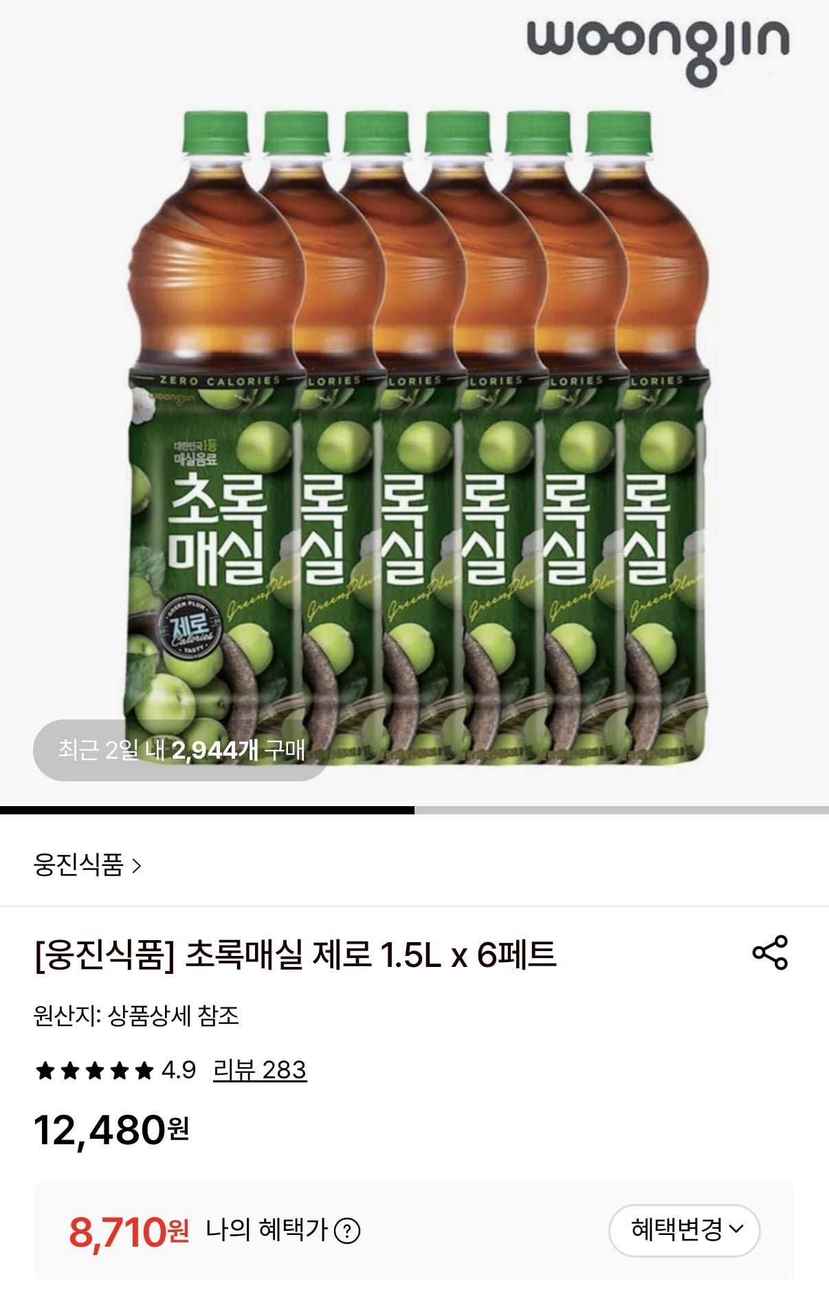 [롯데온]초록매실 제로 1.5L x 6개 (8,710원/무료)