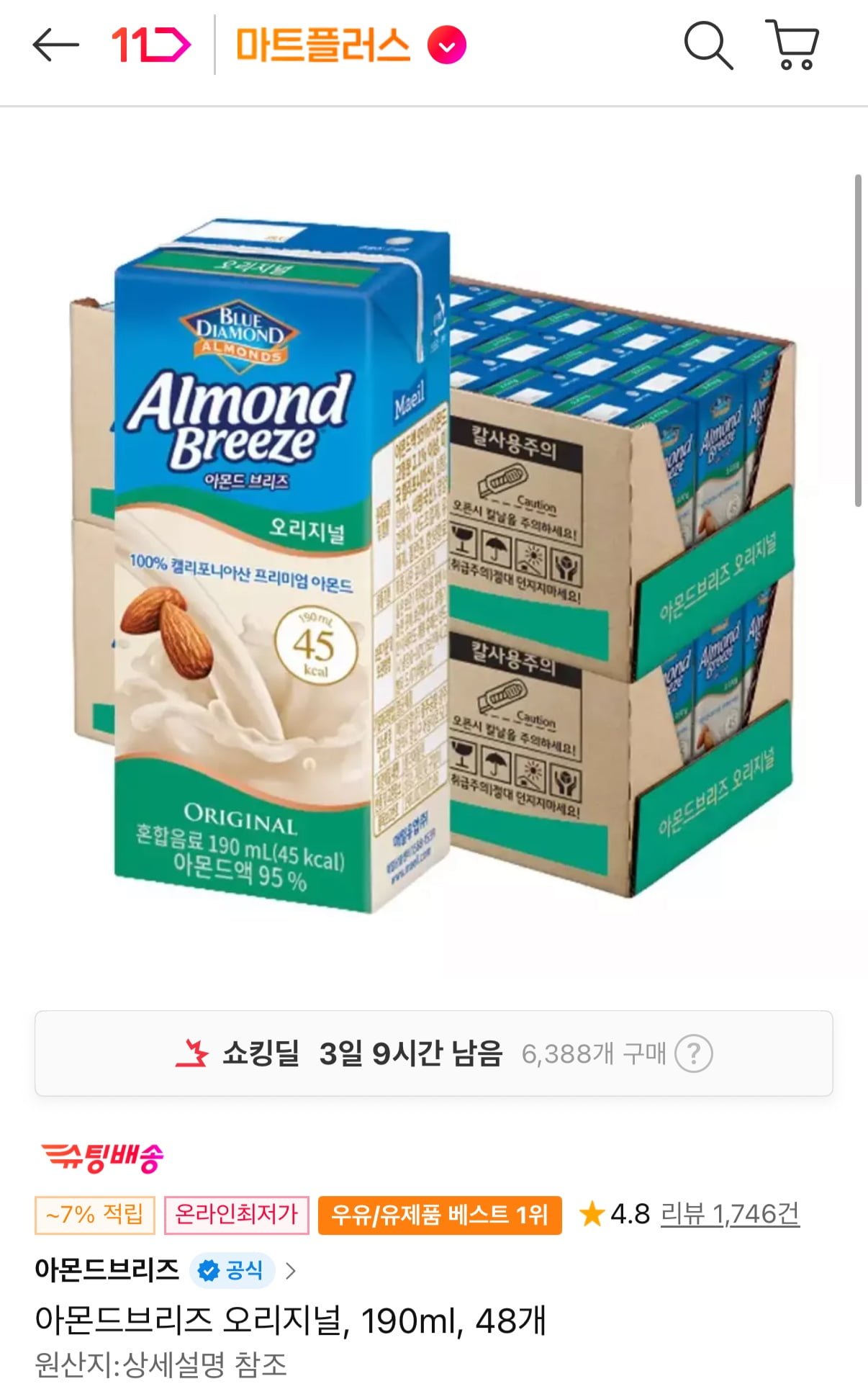 [11번가]아몬드브리즈 오리지널 190ml 48개 (티멤22,760원) (무료) - 딜모아