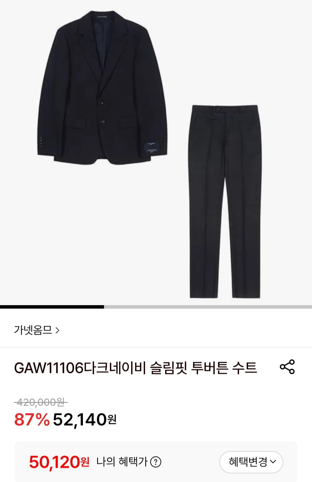 [롯데온]가넷옴므 다크네이비 슬림핏 투버튼 수트 (50,120원/무료)