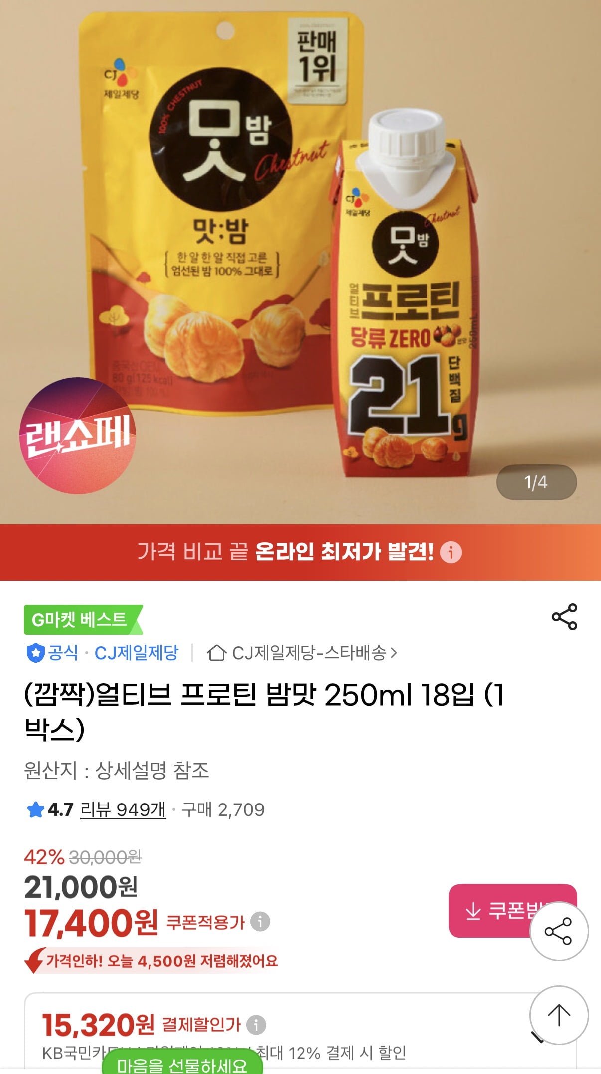 [지마켓]얼티브 프로틴 맛밤맛 단백질 21g 음료 250ml x18개 (15,320원/무료) - 딜모아
