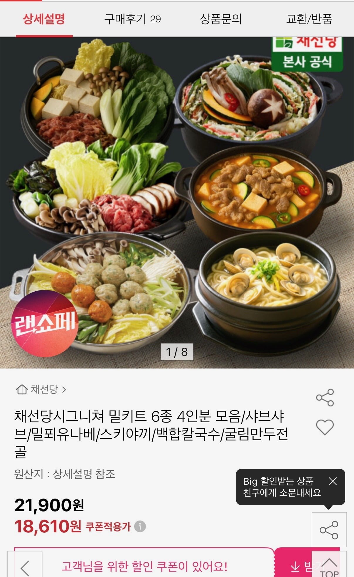 [옥션]채선당시그니쳐 밀키트 6종 4인분모음 (19,270원/무료)