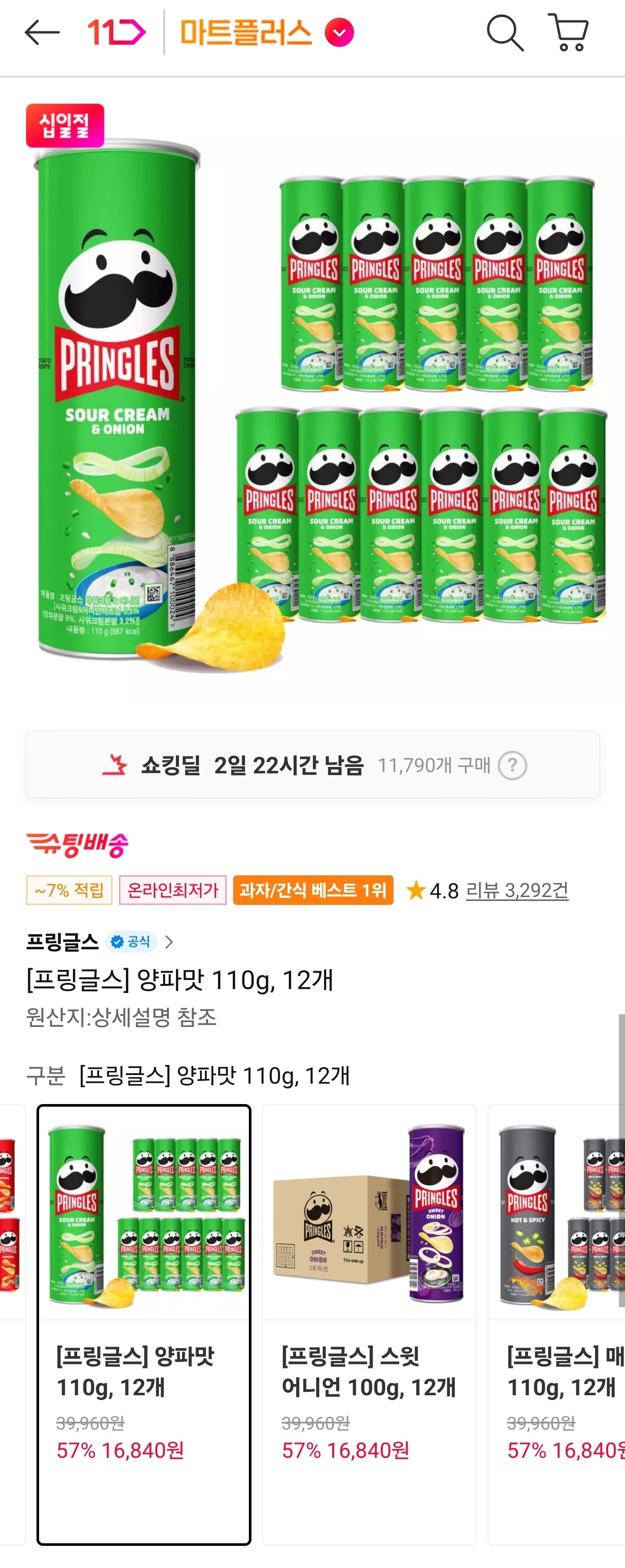 [11번가]프링글스 양파맛 110g 12개 (티멤버16,840원/무료)