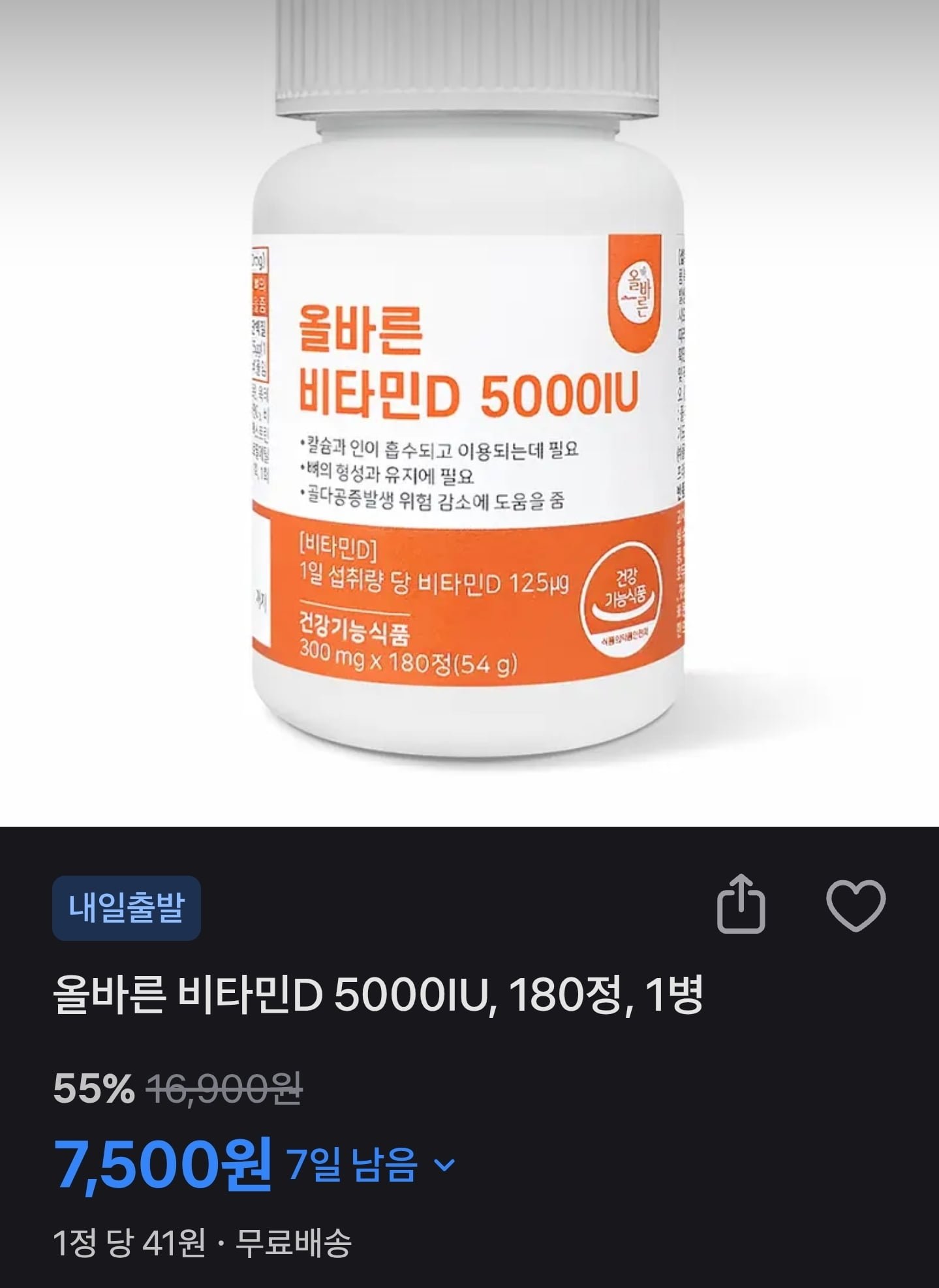 [토스쇼핑]올바른 비타민D 5000IU, 180정, 1병 55%할인, (7,500원/무배) - 딜모아