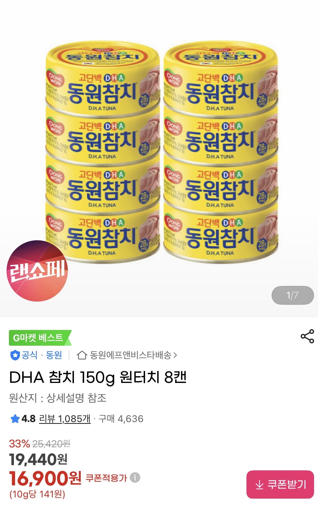 [지마켓]동원 DHA 참치 150g 원터치 8캔 (16,900원/무료) 농협우리 14880원