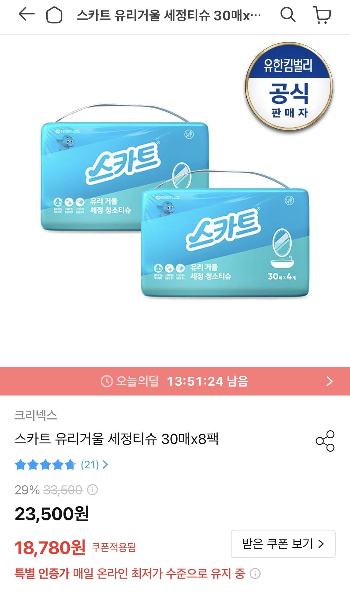 [오늘의집]스카트 유리거울 세정티슈 30매x8팩(토페 16,902원/무배) - 딜모아
