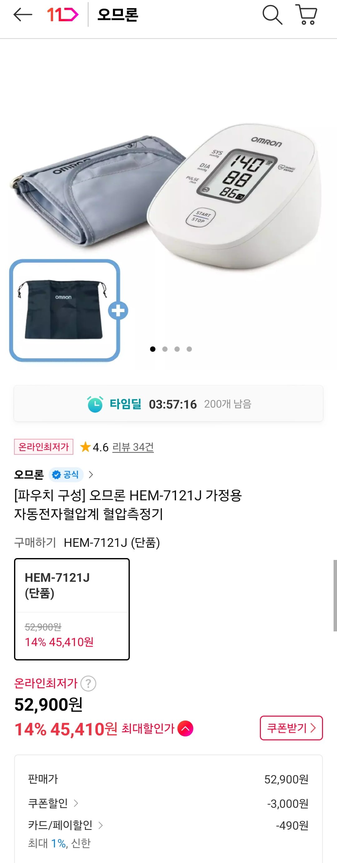 [11번가]오므론 HEM-7121J 가정용 자동전자혈압계(45,900원/무료)