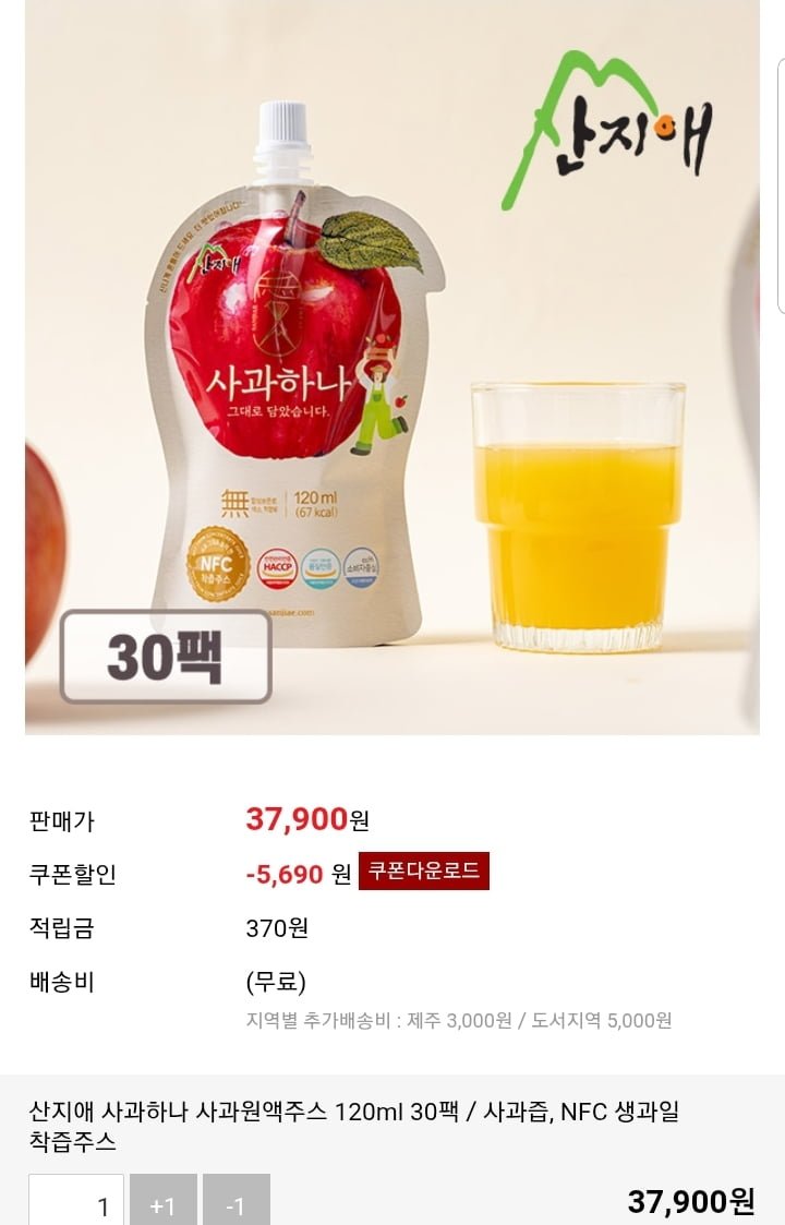 [자사몰]산지애 사과하나 사과 원액 쥬스 120ml 30개 (32,210원/무배)