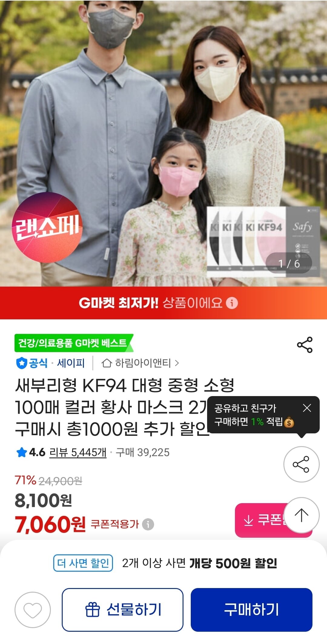 [G마켓]새부리형 KF94 대형 중형 소형 마스크 100매 (유클 7,060원/무료)