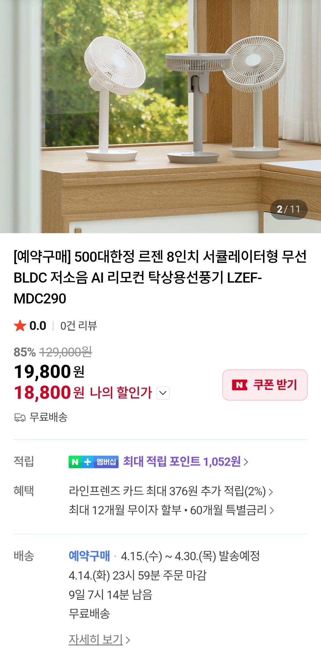 [네이버]르젠 8인치 무선 BLDC 탁상용 선풍기 (18,800원/무료)