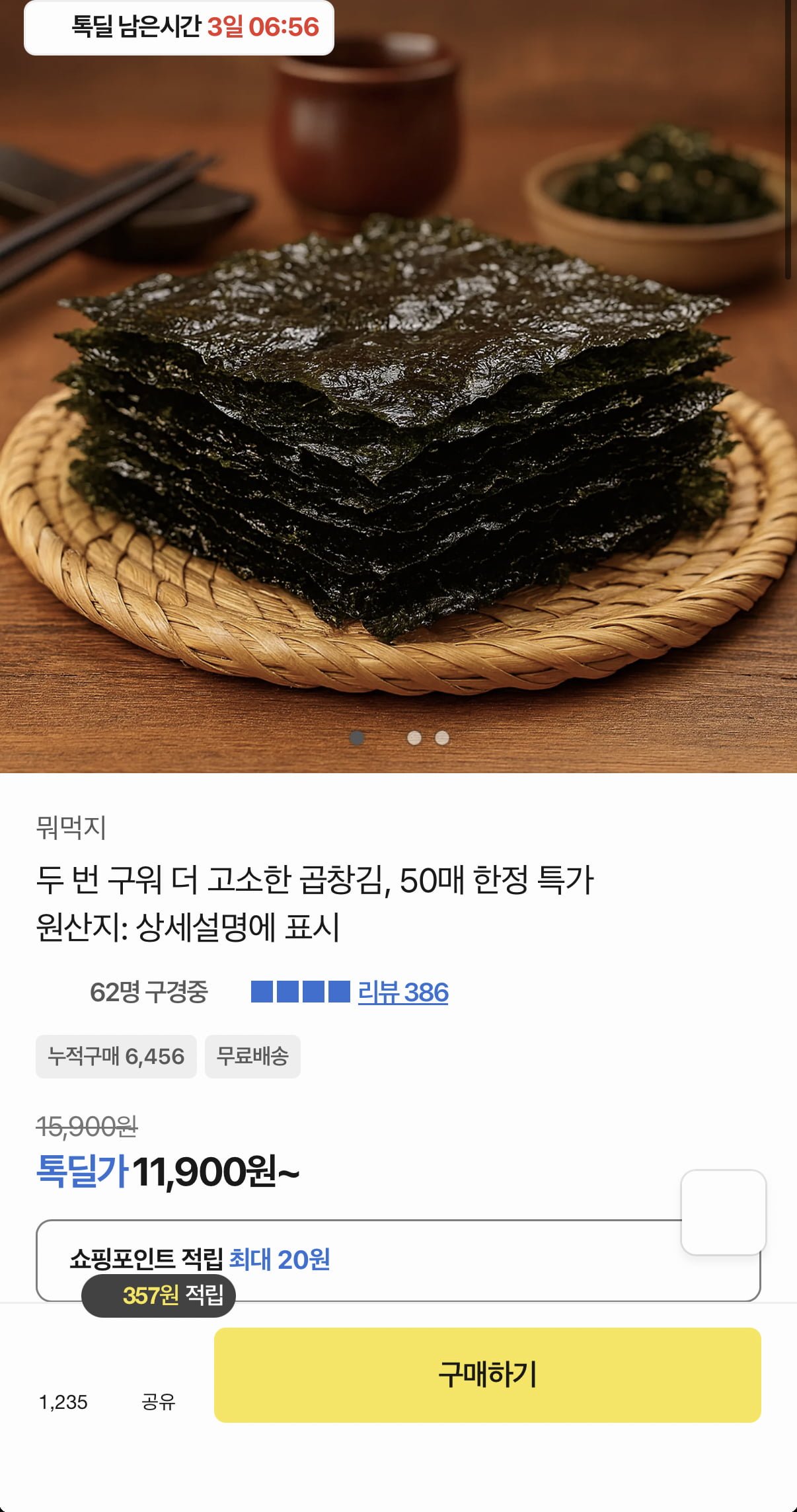 [카카오]두번구운 곱창김 50매 140g 1봉 (11,900원/무료)