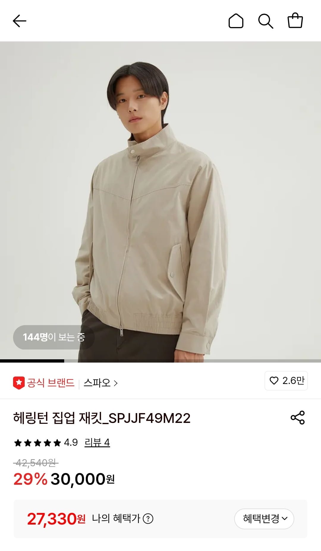 [롯데온]헤링턴 집업 재킷_SPJJF49M22 (27,330원/무료) - 딜모아
