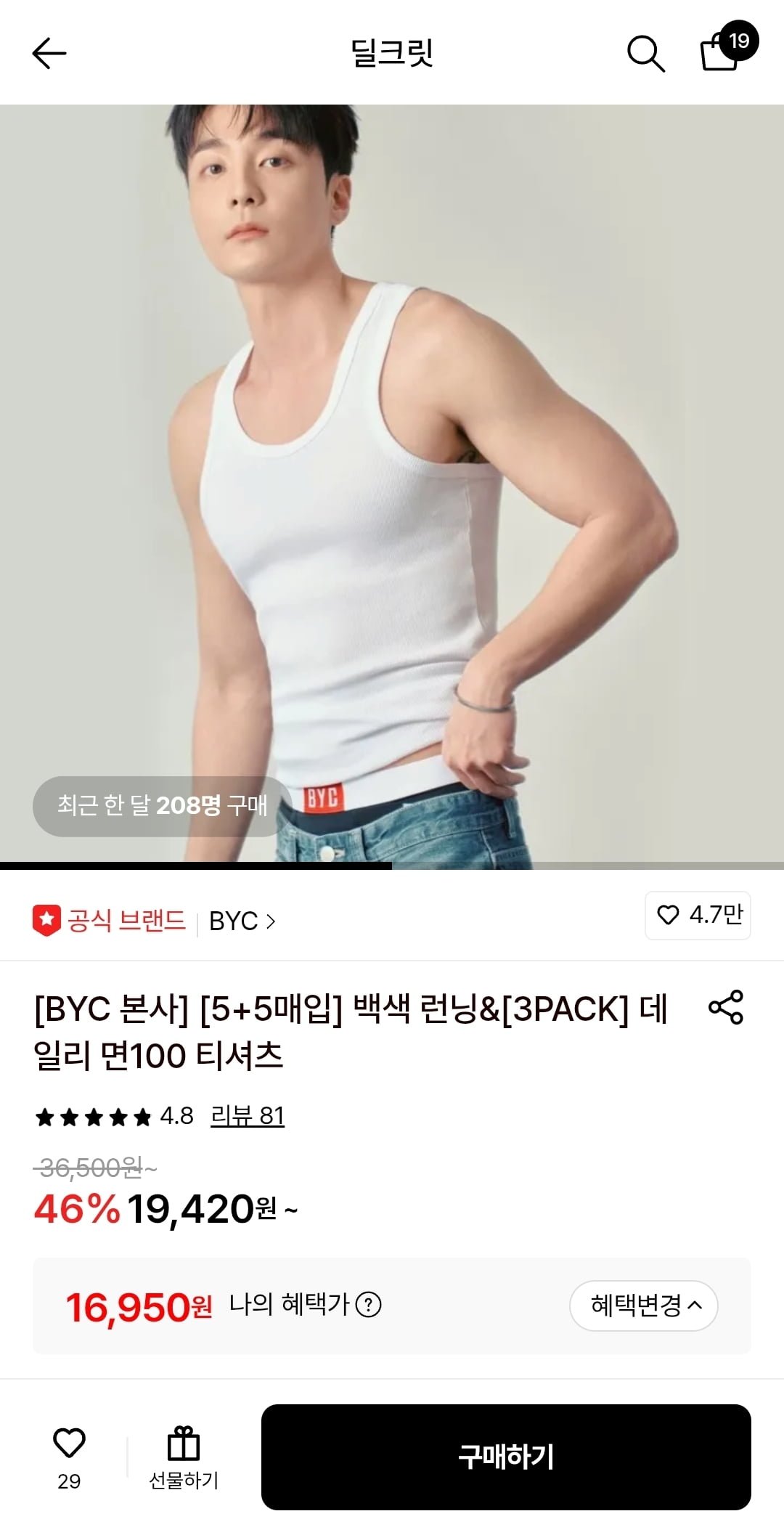 [롯데온]BYC 순면런닝 10매세트 (16,950원/무배) - 딜모아