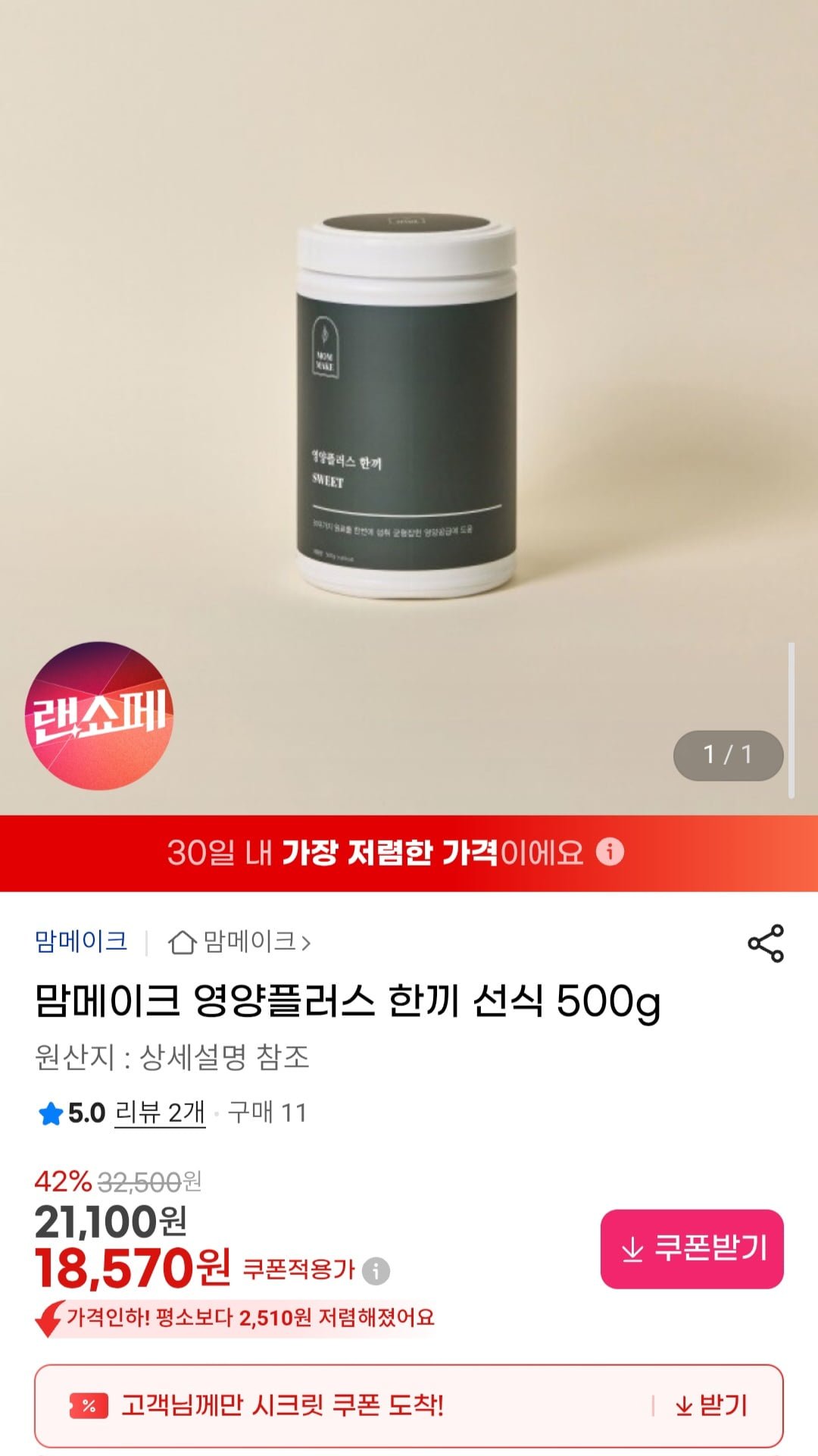 [G마켓]맘메이크 영양플러스 한끼 선식 500g (18,570원/무료)
