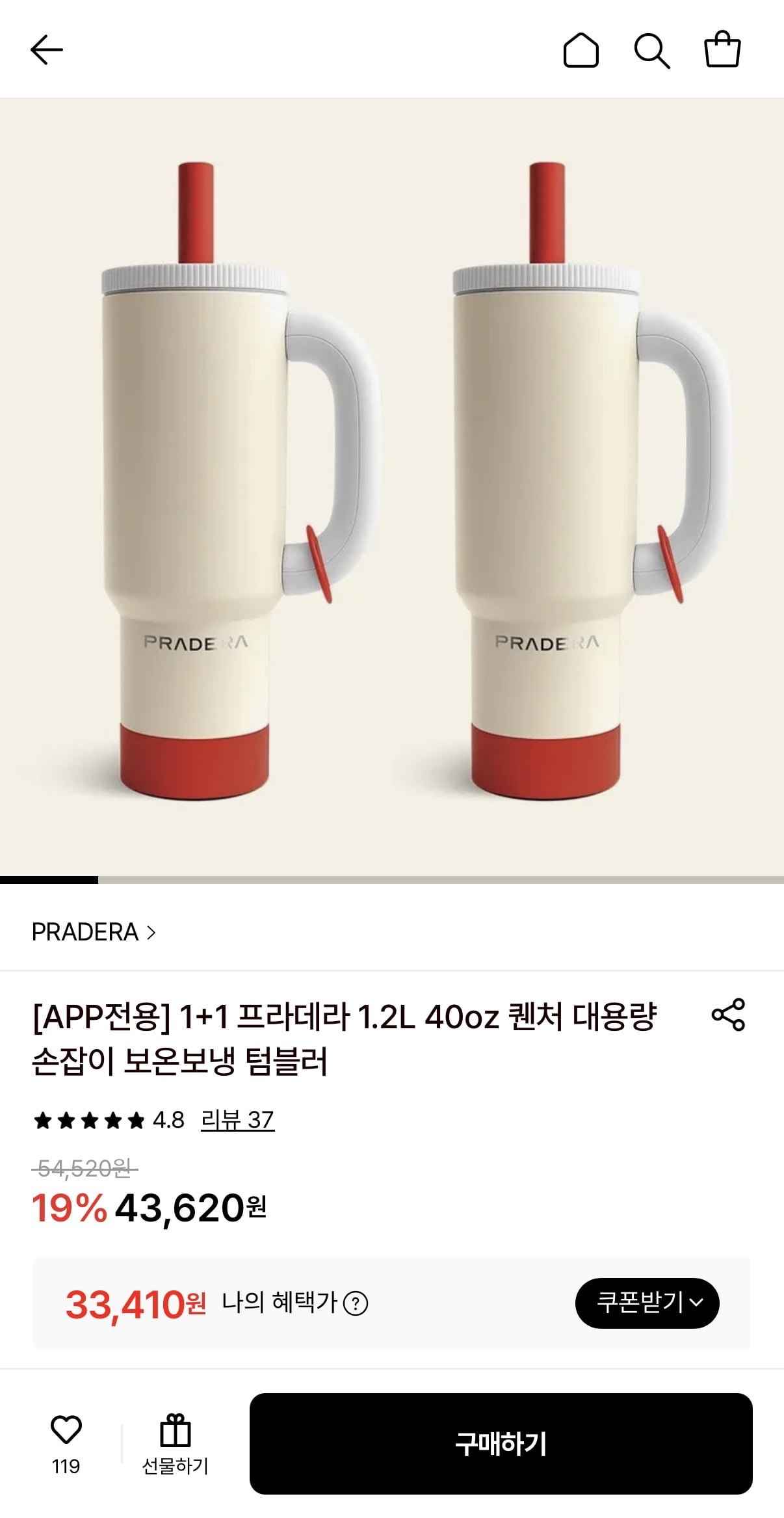 [롯데온]프라데라 1.2L 40oz 대용량 보온보냉 텀블러 1+1 (33,410원/무배) - 딜모아