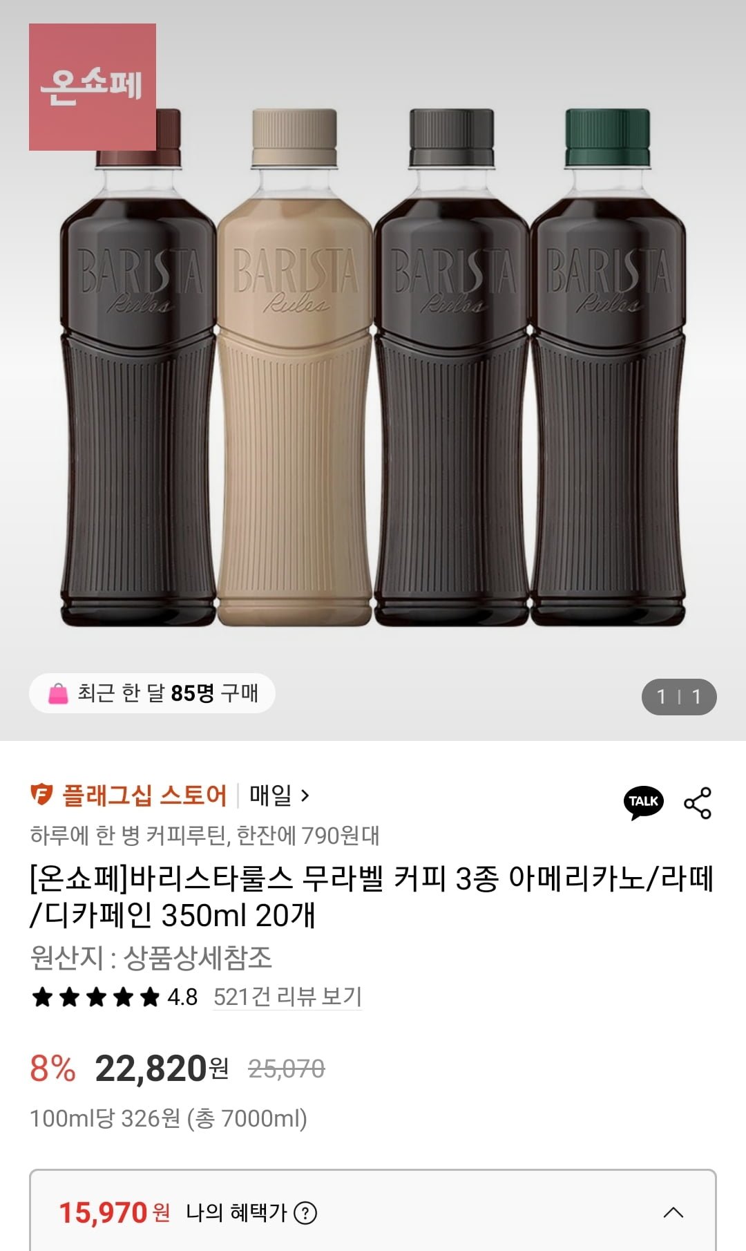 [롯데온]바리스타룰스 무라벨 커피 3종 350ml 20개 (15,970원/무료)