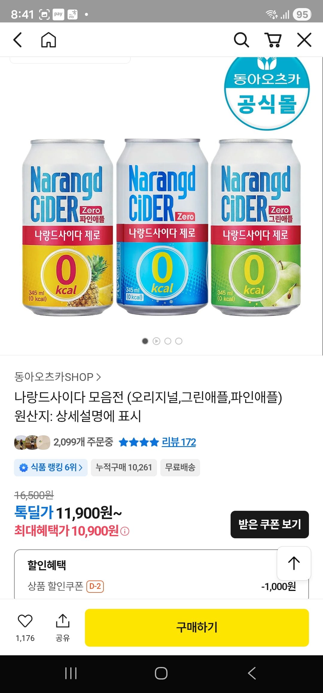 [카카오][톡딜]나랑드사이다 모음전 (오리지널,그린애플,파인애플) 24개 345ml(10900원/무배)