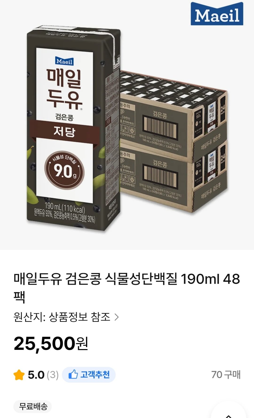 [NS홈쇼핑]매일두유 검은콩 식물성단백질 190ml 48팩 (25,500원 / 무료)