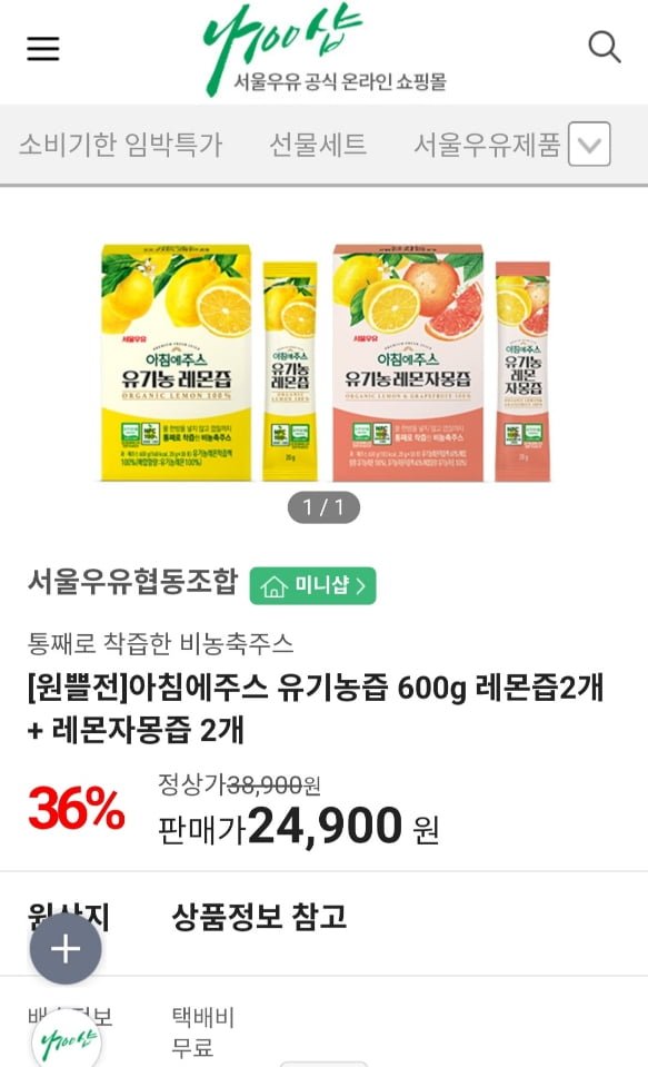 [나100샵]서울우유 아침에주스 유기농즙 600g 레몬즙2개 + 레몬자몽즙 2개 (24,900원/무료)