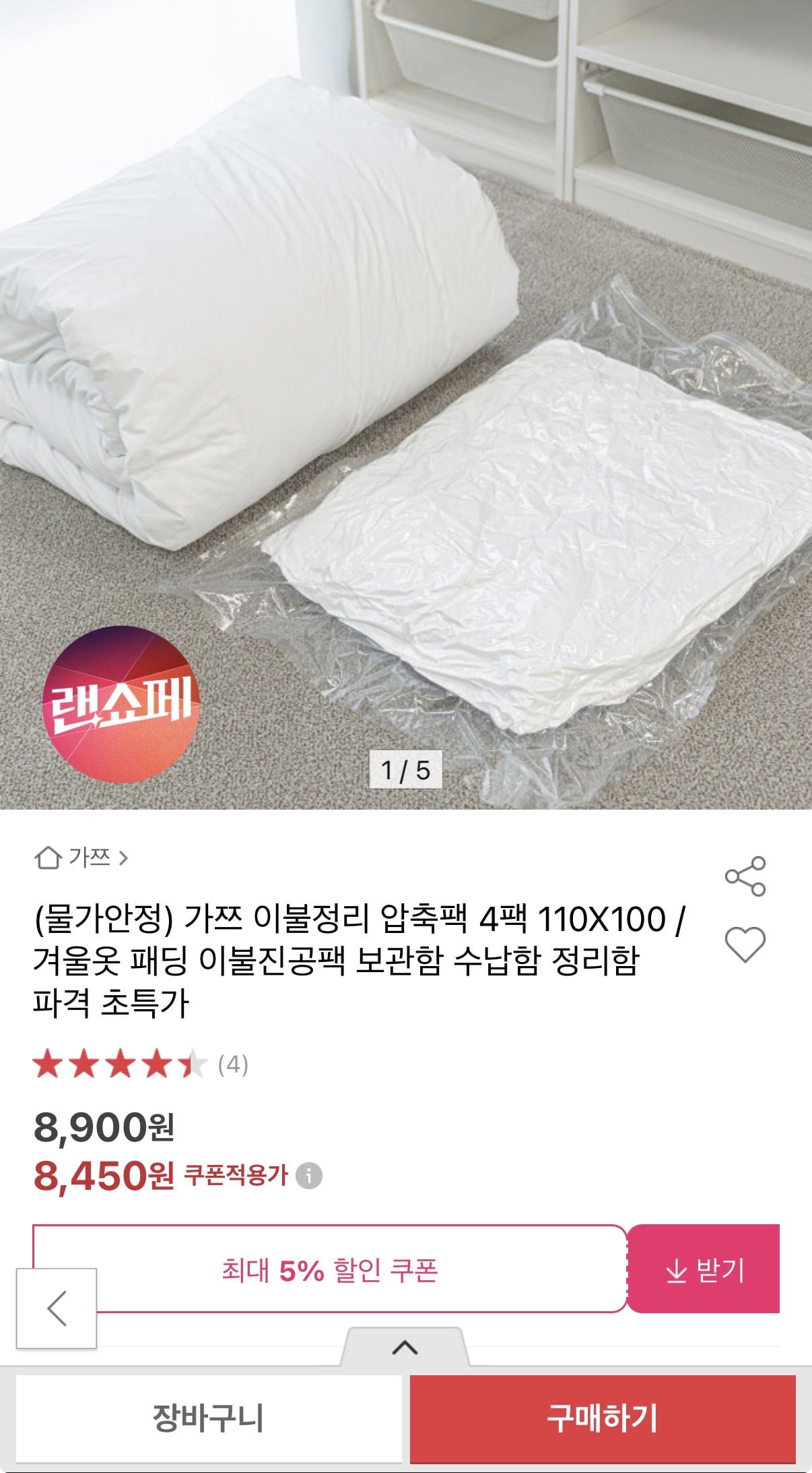 [옥션]이불정리 압축팩 4팩 (8,450원/무료)