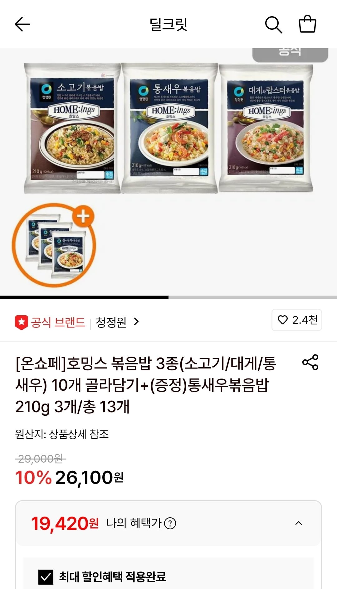 [롯데온]호밍스 볶음밥 3종(소고기/대게/통새우) 10개+통새우볶음밥210g 3개 증정 (19,420원/무료) - 딜모아