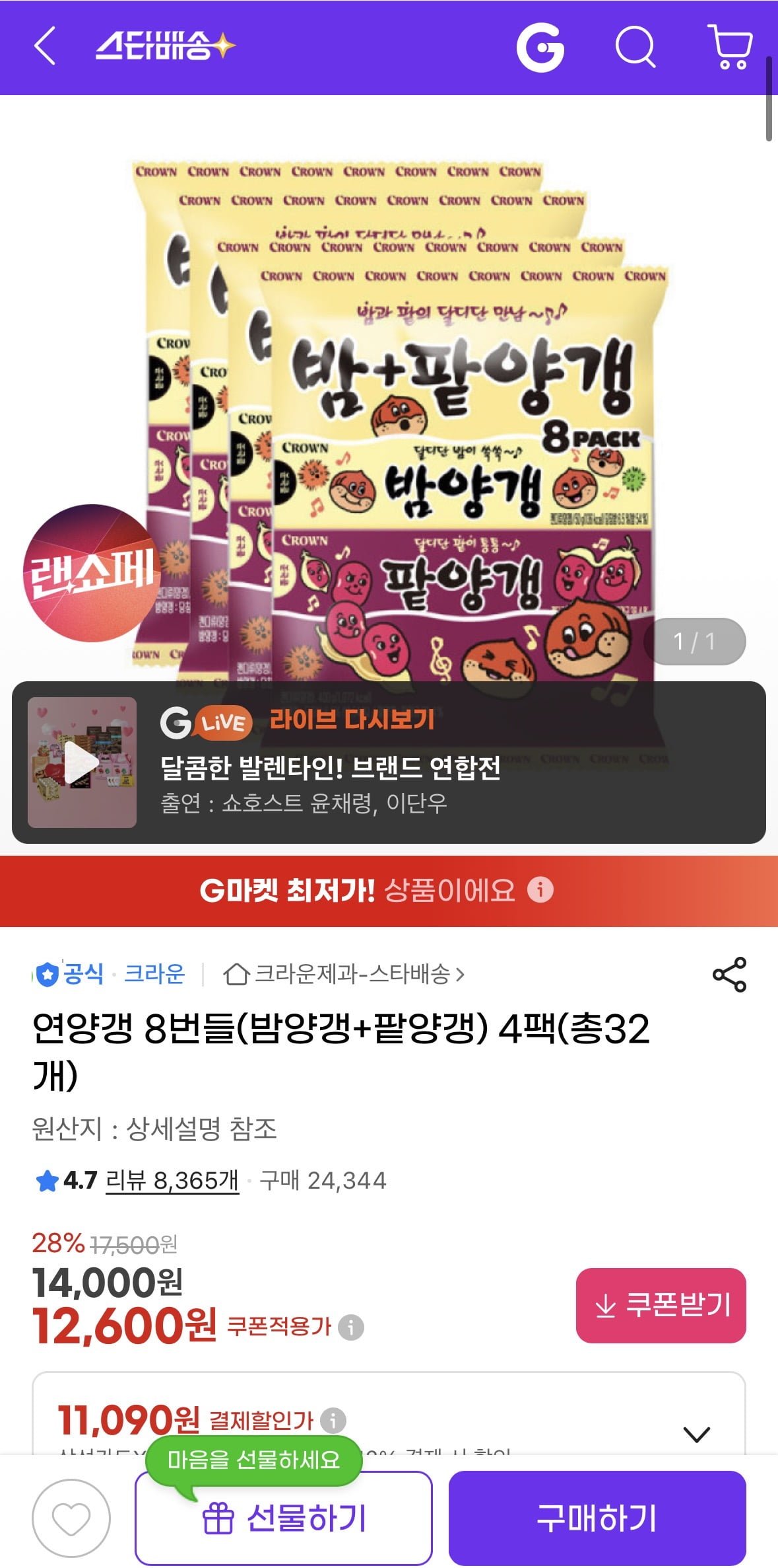 [지마켓]크라운 연양갱 밤양갱+팥양갱 4팩 32개 (스마일11,090원/무료)