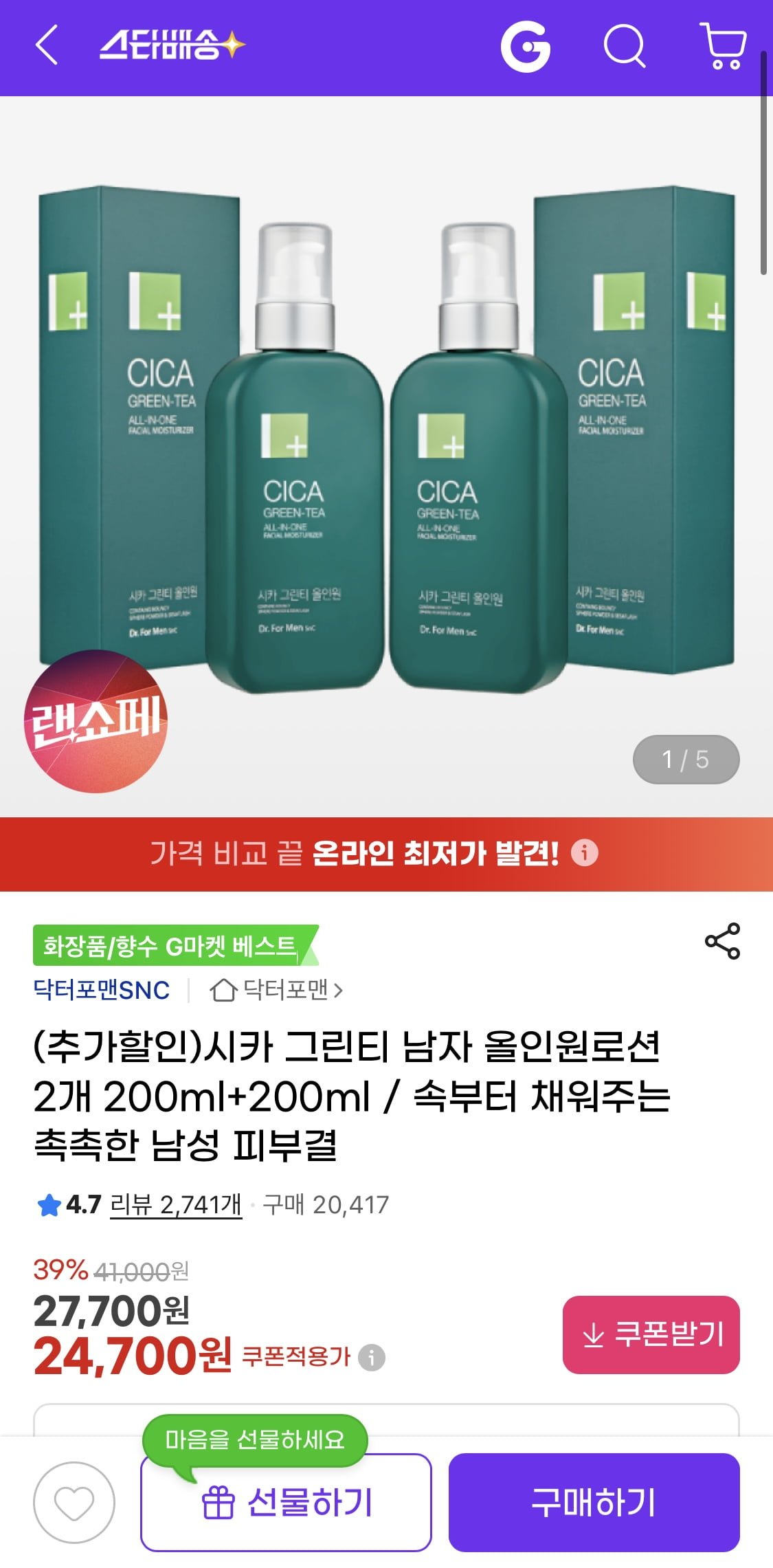 [G마켓]시카 그린티 남자 올인원로션 2개 200ml+200ml (24,700/무배)