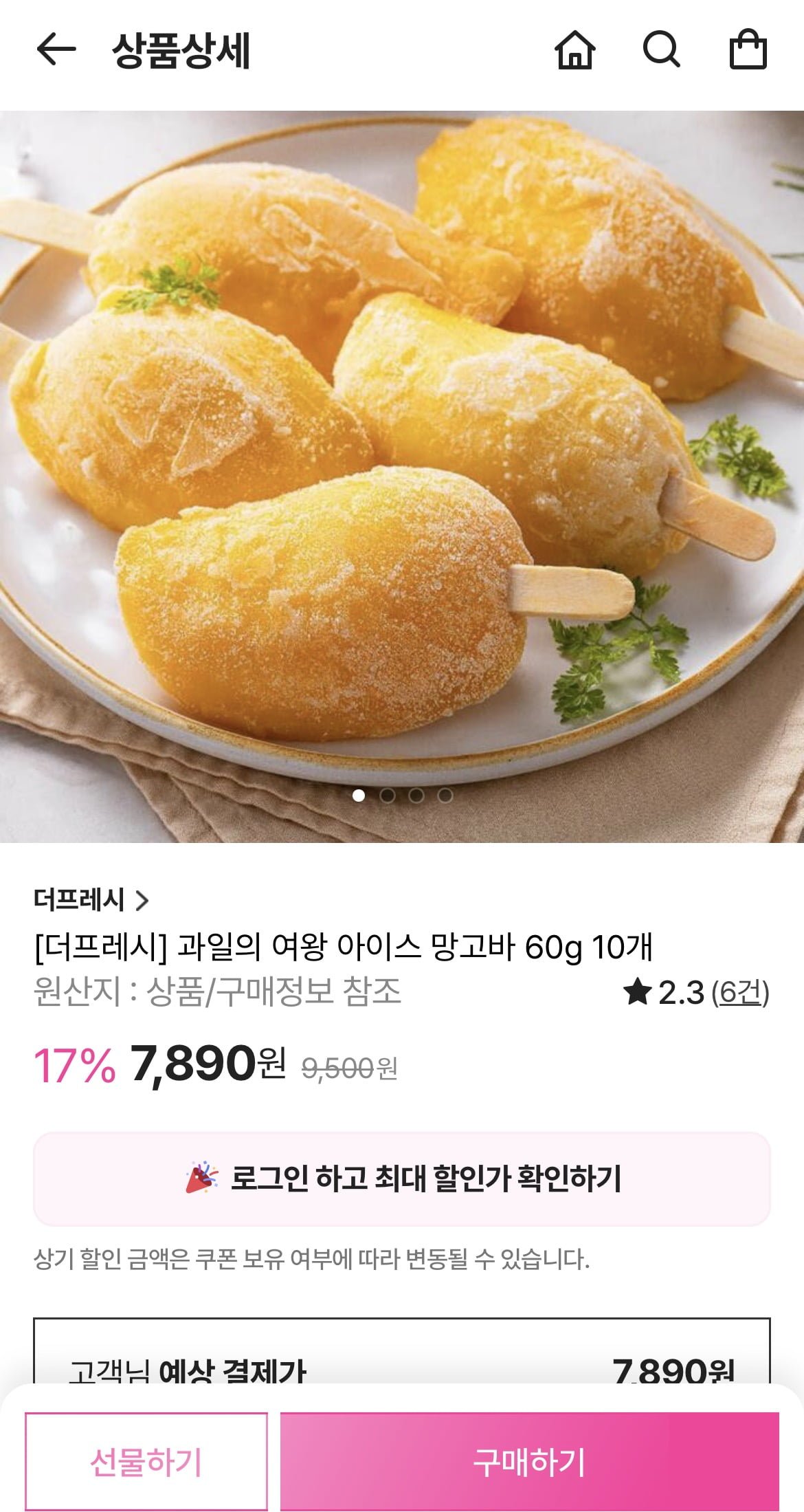 [신세계쇼핑]아이스 망고바 60g 10개 (7,890원/무료)