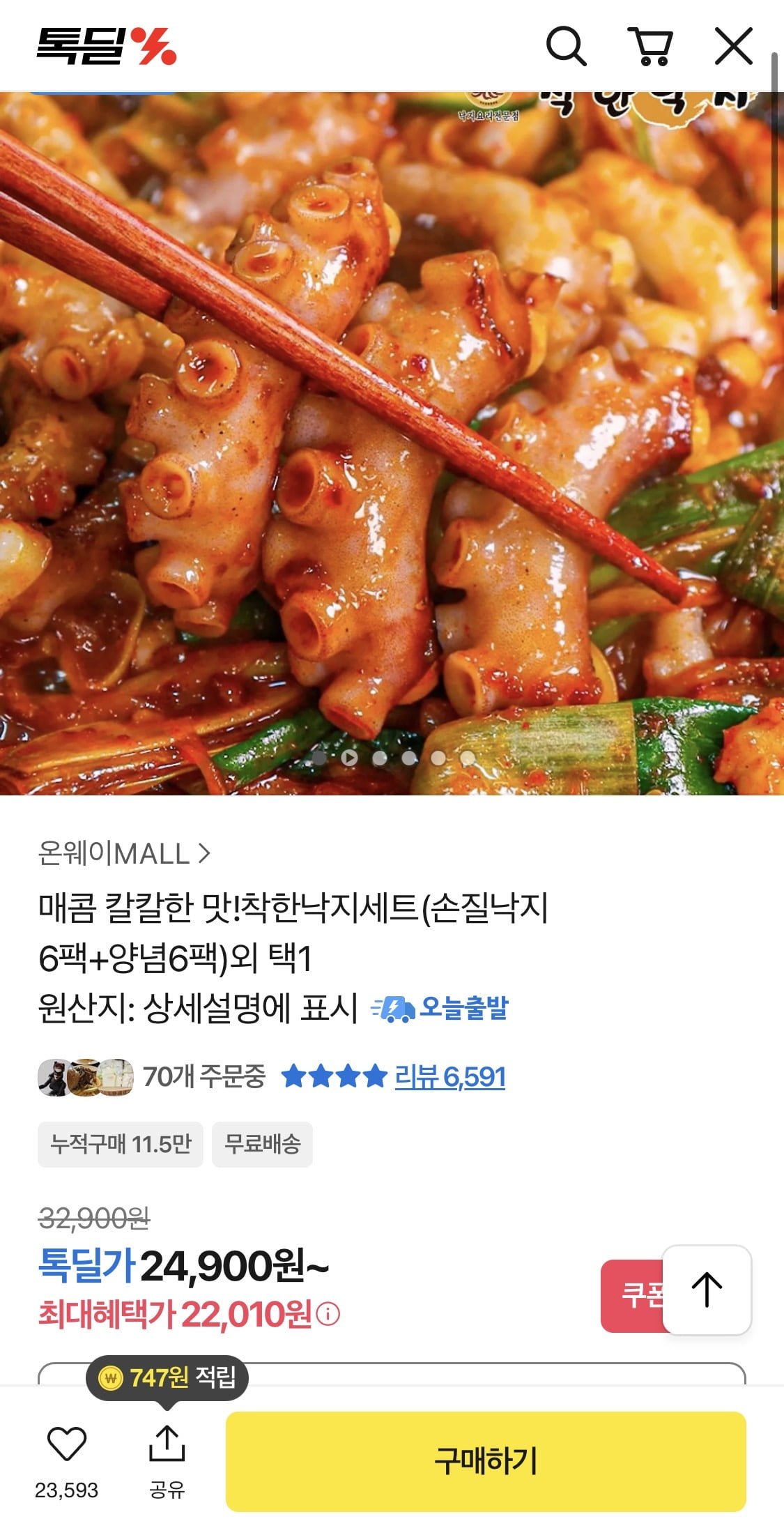 [카카오]착한낙지 손질낙지 135g 6개+비법소스 6개 (22,010원/무료배송)