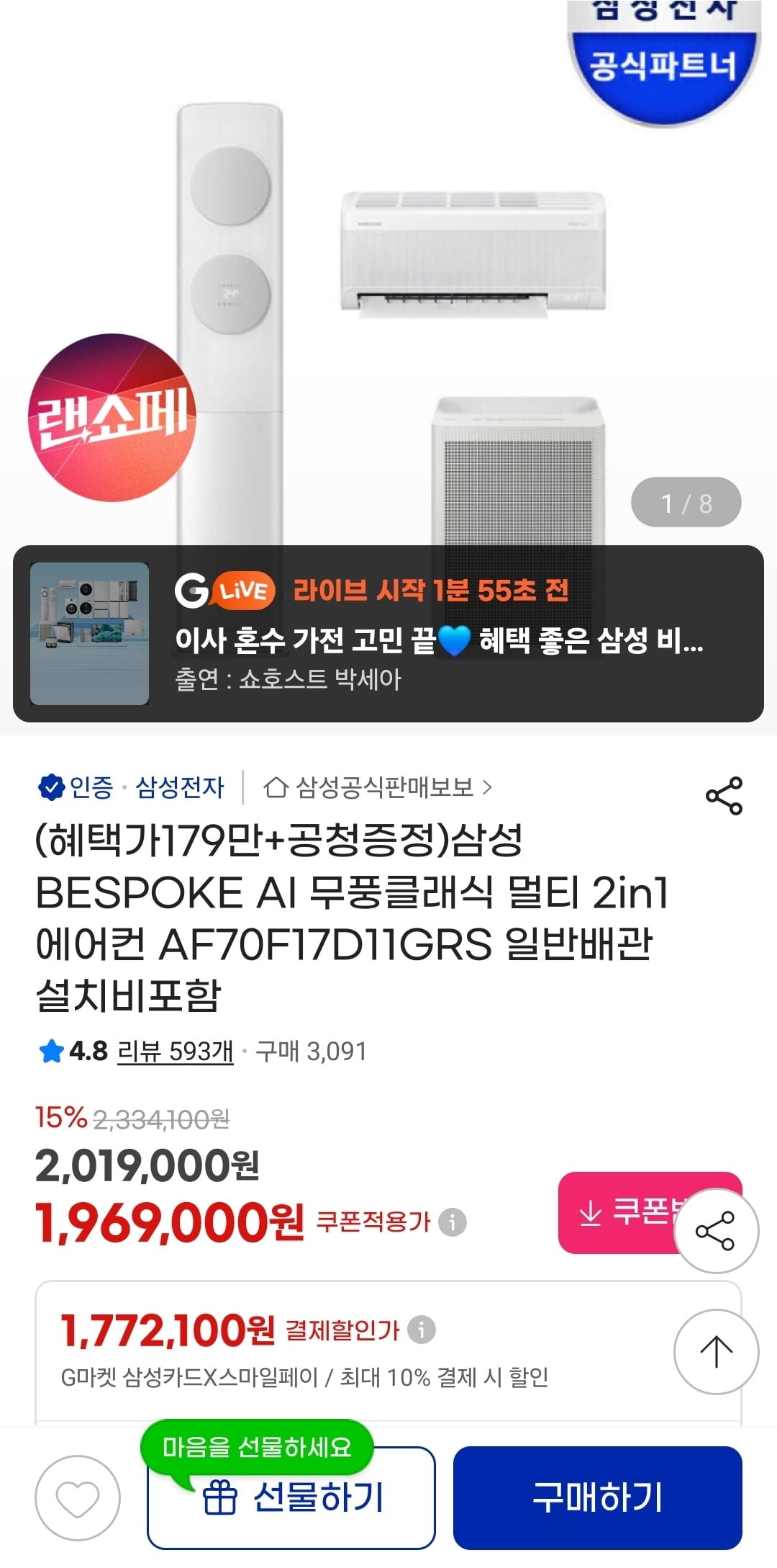 [G마켓]삼성 비스포크 AI 무풍클래식 멀티 2in1 에어컨+공기청정기 증정 (1,791,790원/무료)