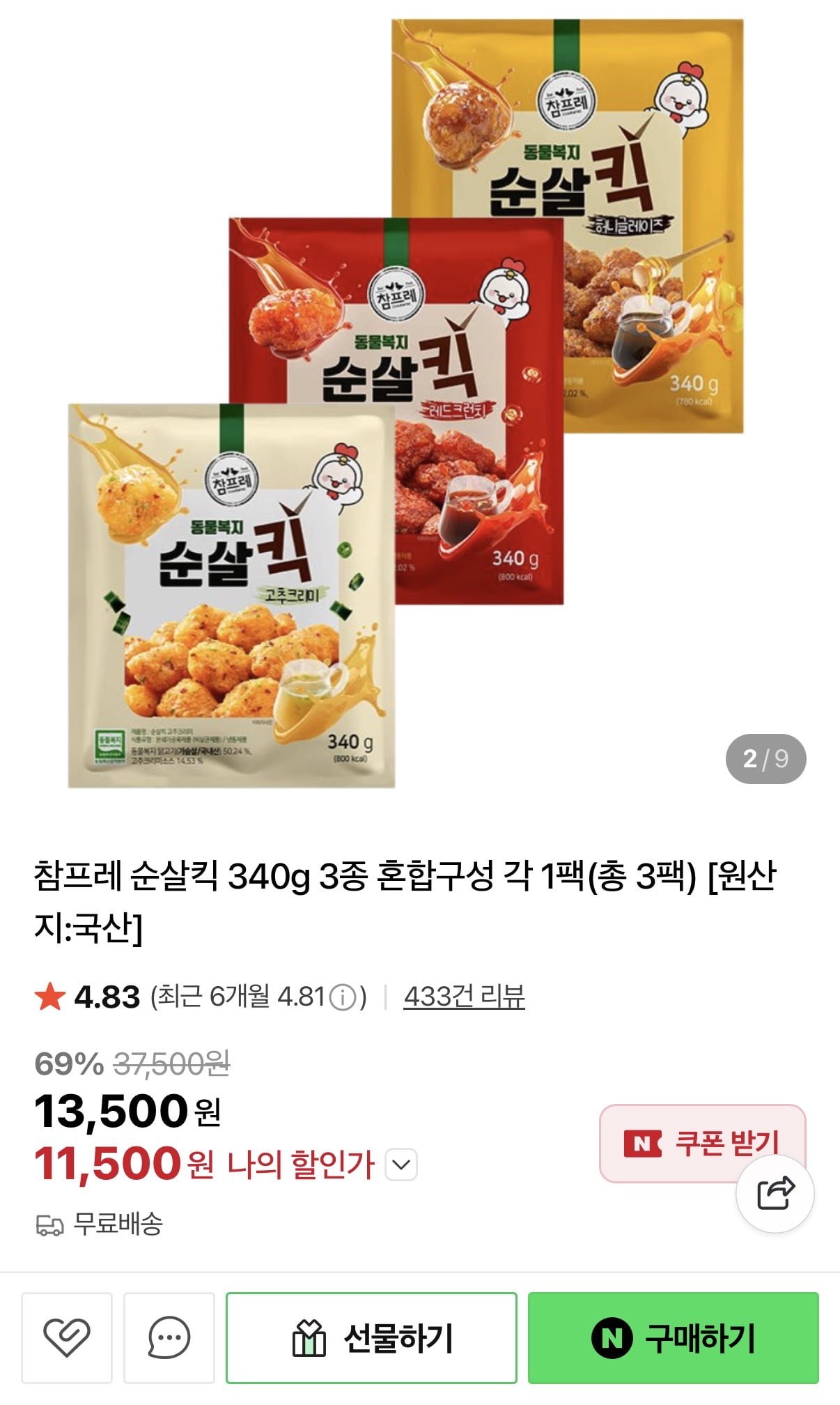 [네이버]참프레 순살킥 고추크리미 340g 3팩 (11,500원/무료)