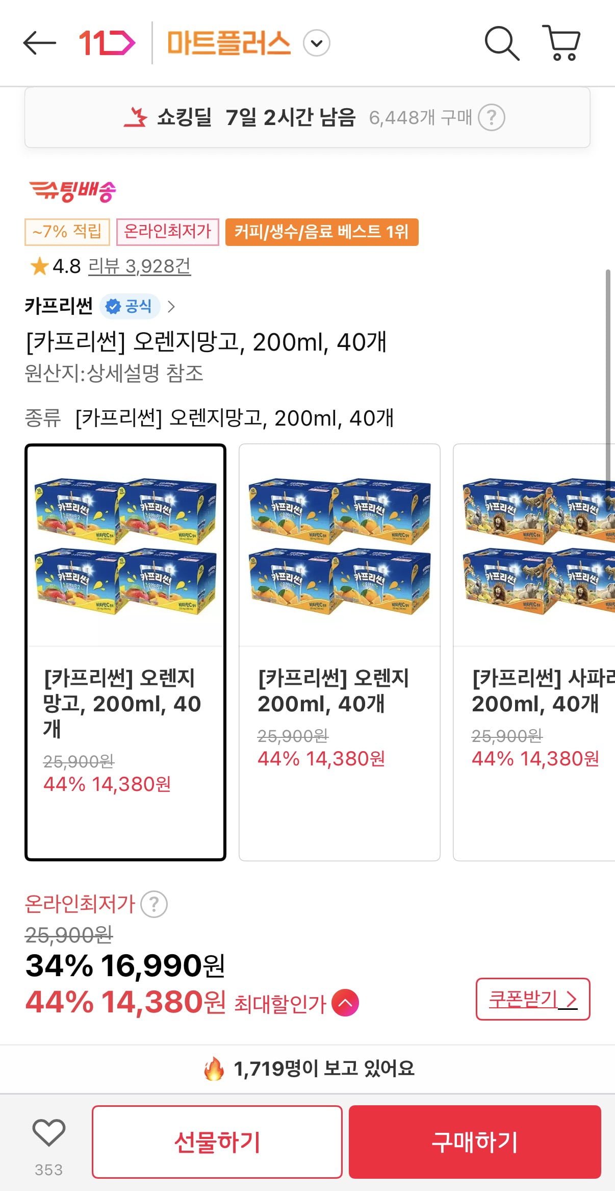 [11번가]카프리썬 오렌지망고, 200ml, 40개(티멤 14,380원/무료배송)