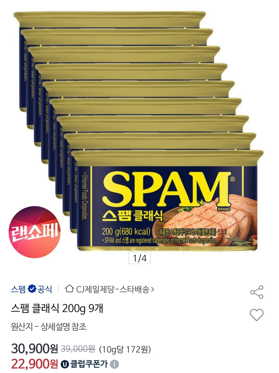 옥션)스팸 클래식 200g 9개(20,150,무배)