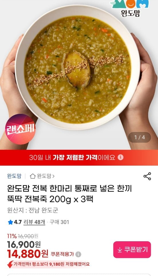[지마켓]완도맘 전복 한마리 통째로 넣은 한끼뚝딱 전복죽 200g x 3팩 (14,880원/무료) - 딜모아