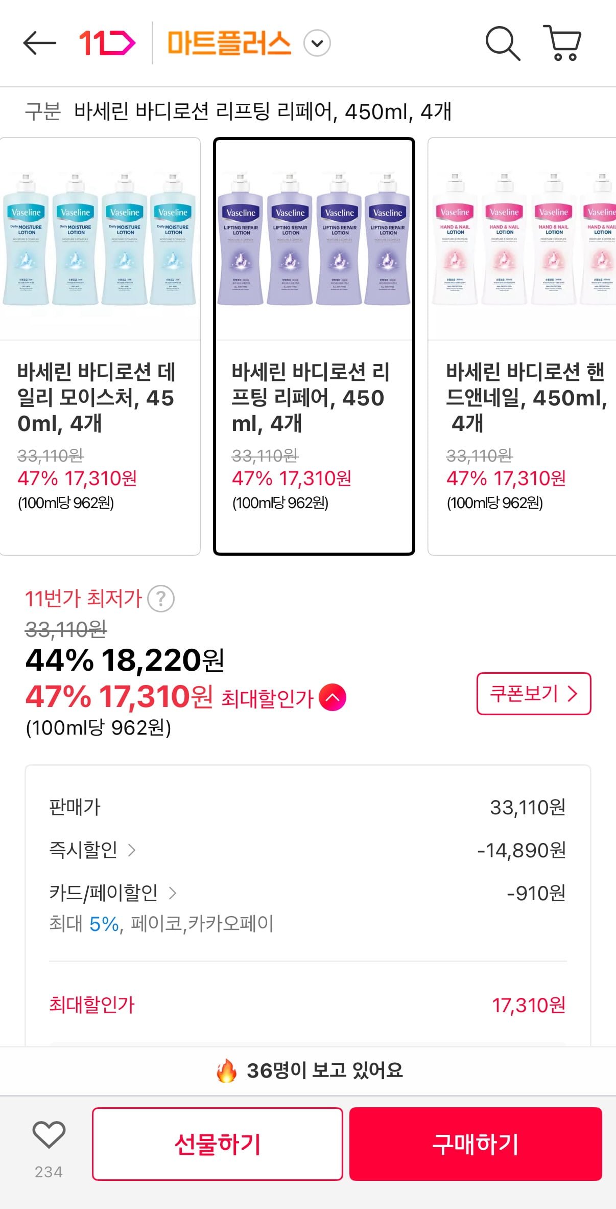 [11번가]바세린 바디로션 리프팅 리페어, 450ml, 4개 (17,310원/무료)