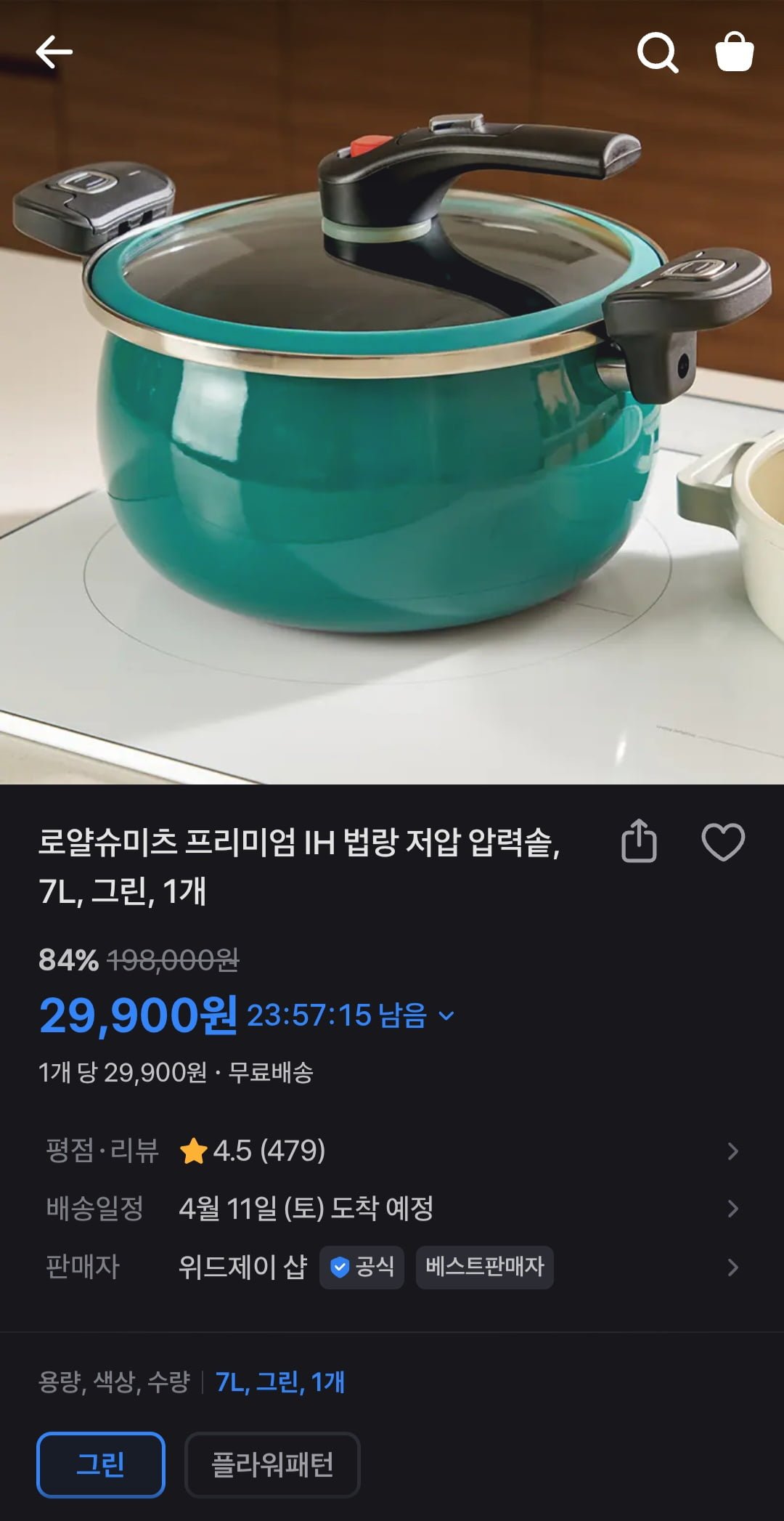 토스)프리미엄 IH 법랑 저압 압력솥 7L (29,900원/무료)