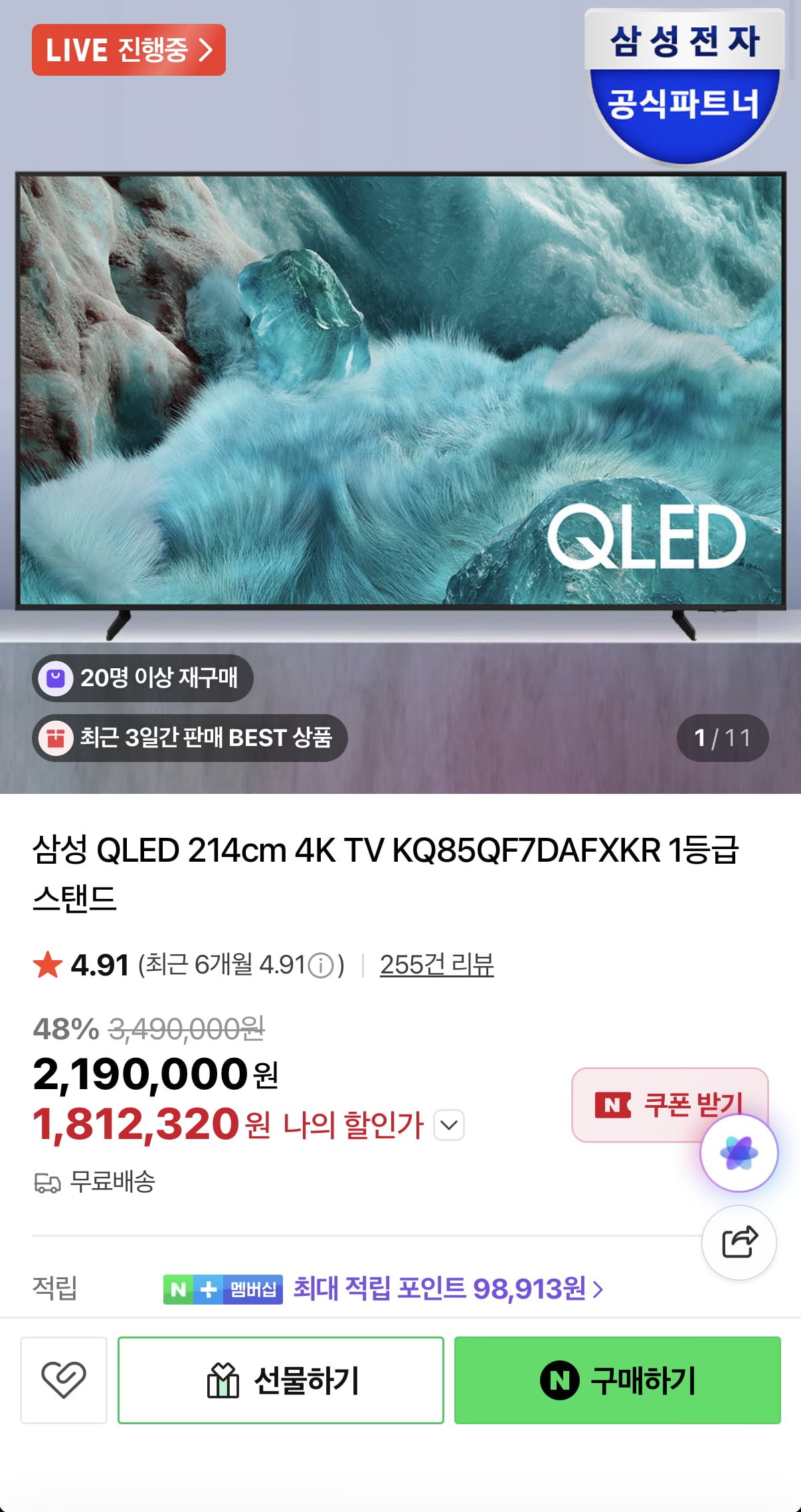 [네이버]삼성 85인치 QLED KQ85QF7DAFXKR + 사운드바 증정 (1,812,320/무료)