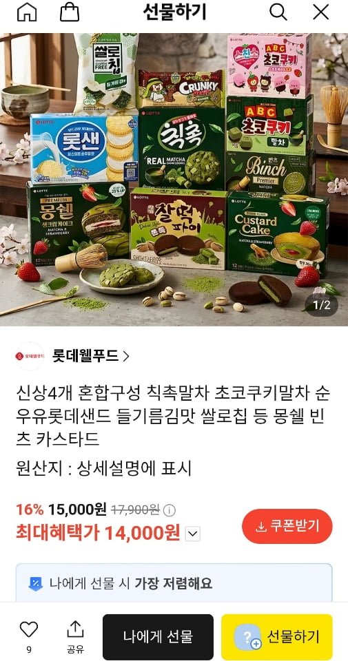 [카카오]롯데 칙촉말차 초코쿠키말차 순우유롯데샌드 등 골라담기 (14,000원/무료)