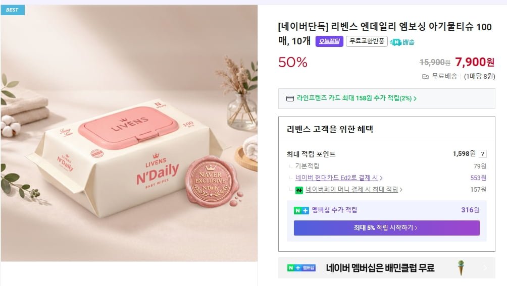 [네이버]리벤스 엔데일리 물티슈 100매, 10개(7,900/무배)