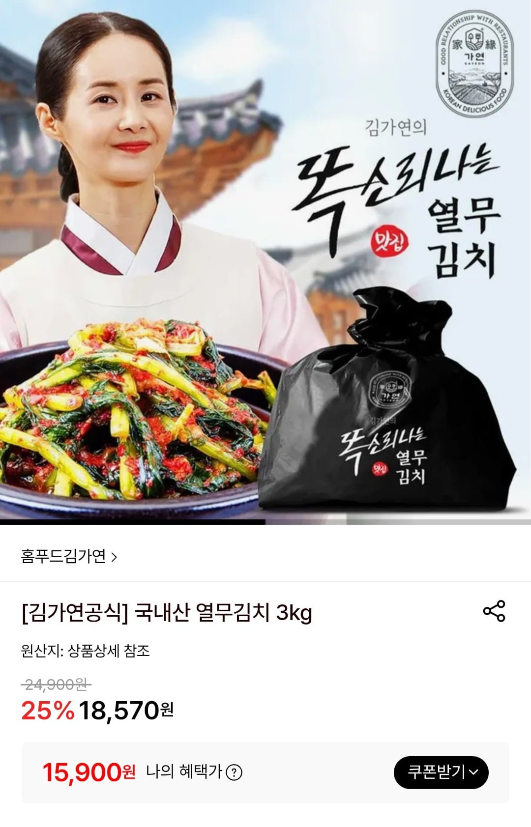 [롯데온]김가연 국내산 열무김치 3kg (15,900원/무료)