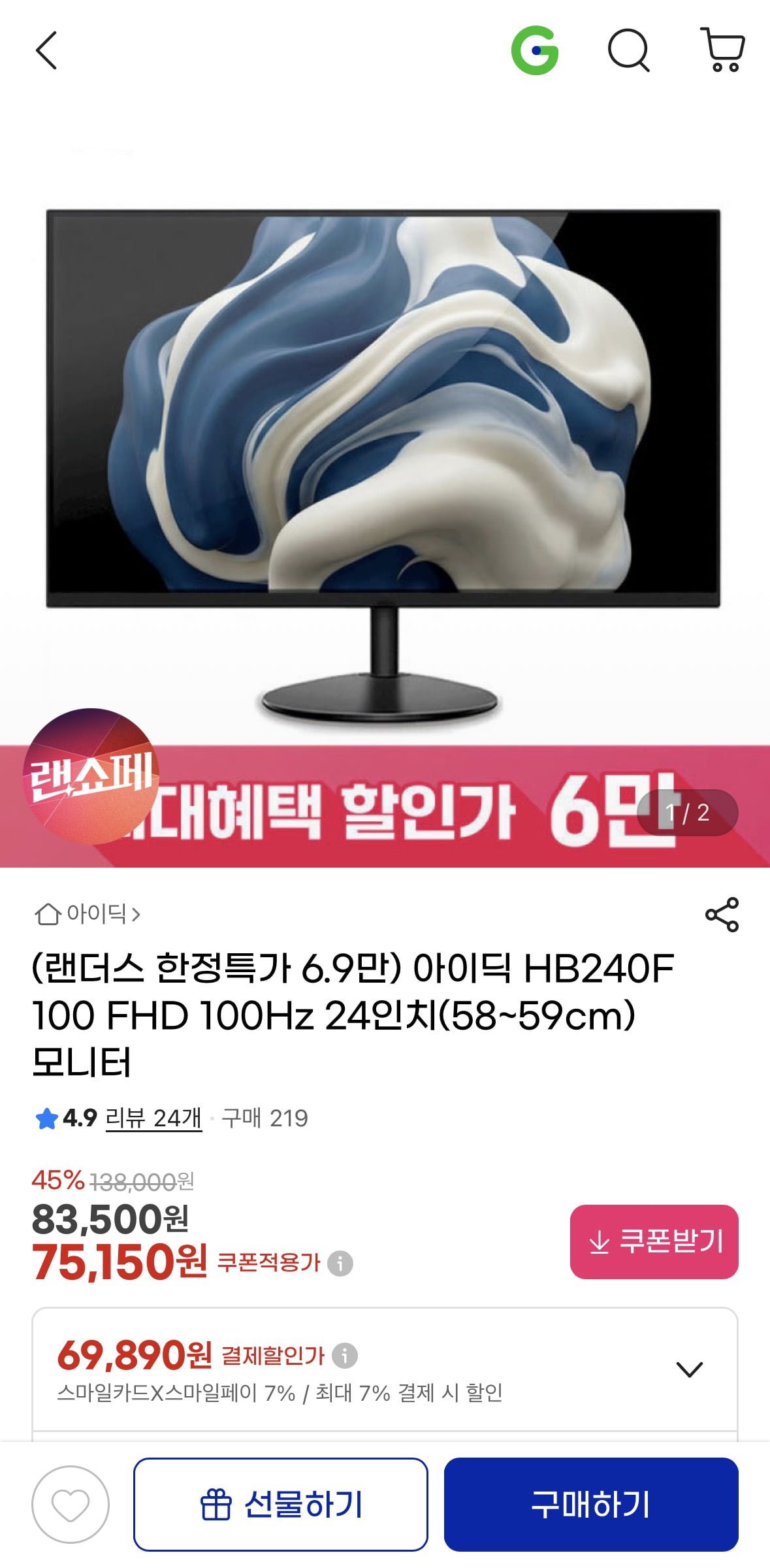 [G마켓]24인치 IPS 100Hz 모니터 (75,150/무배)