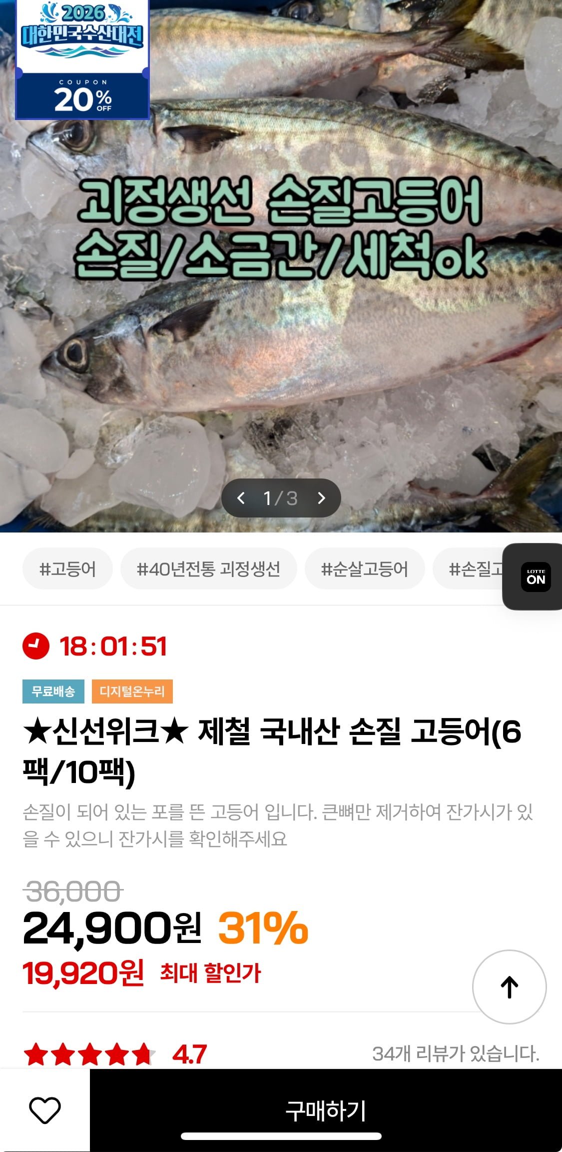 [인더마켓]제철 국내산 손질 고등어 6팩 (19,920원/무료)