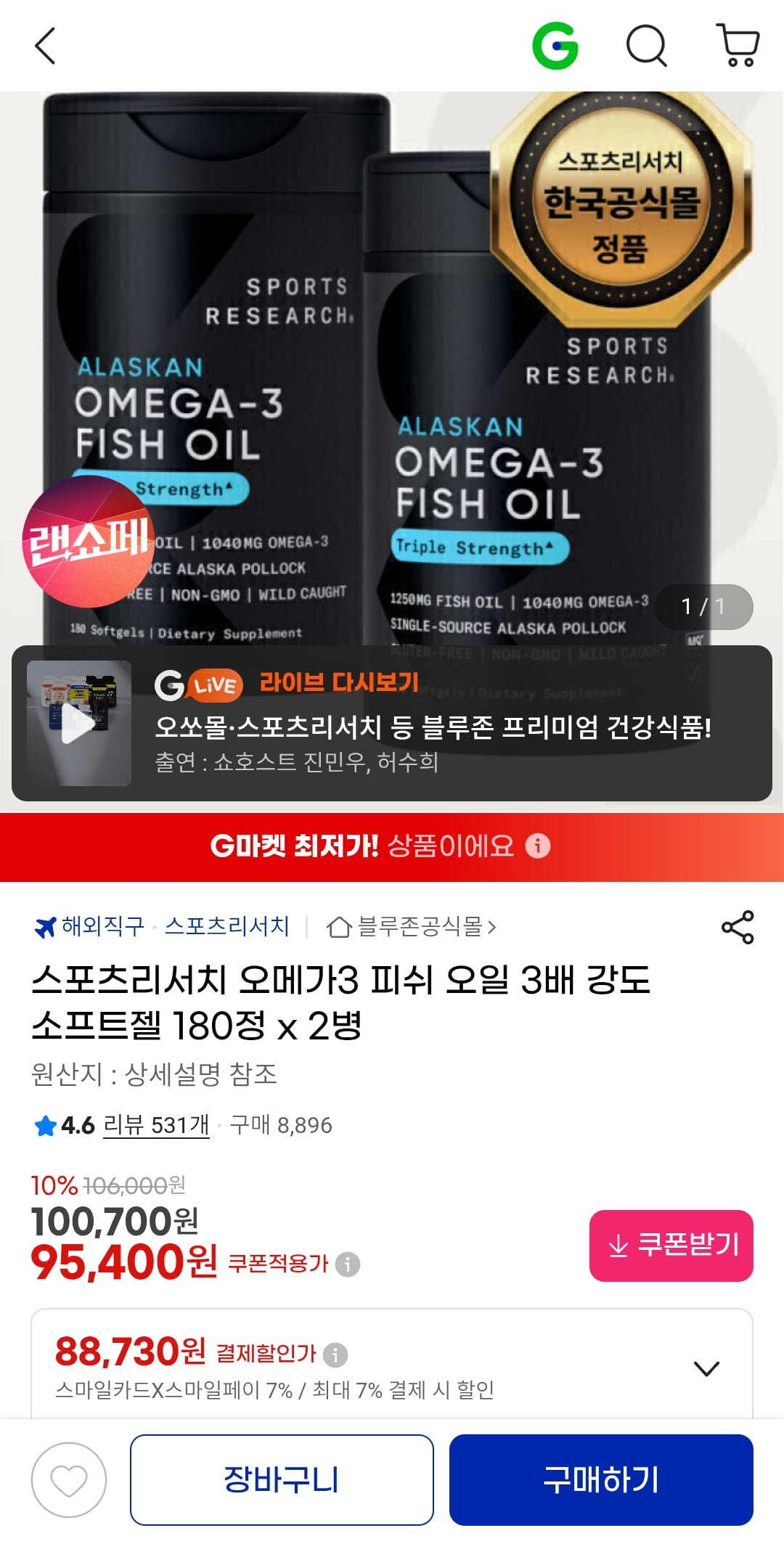 [지마켓]스포츠리서치 오메가3 피쉬 오일 3배 강도 소프트젤 180정 x 2병 (88,730원/무료) - 딜모아