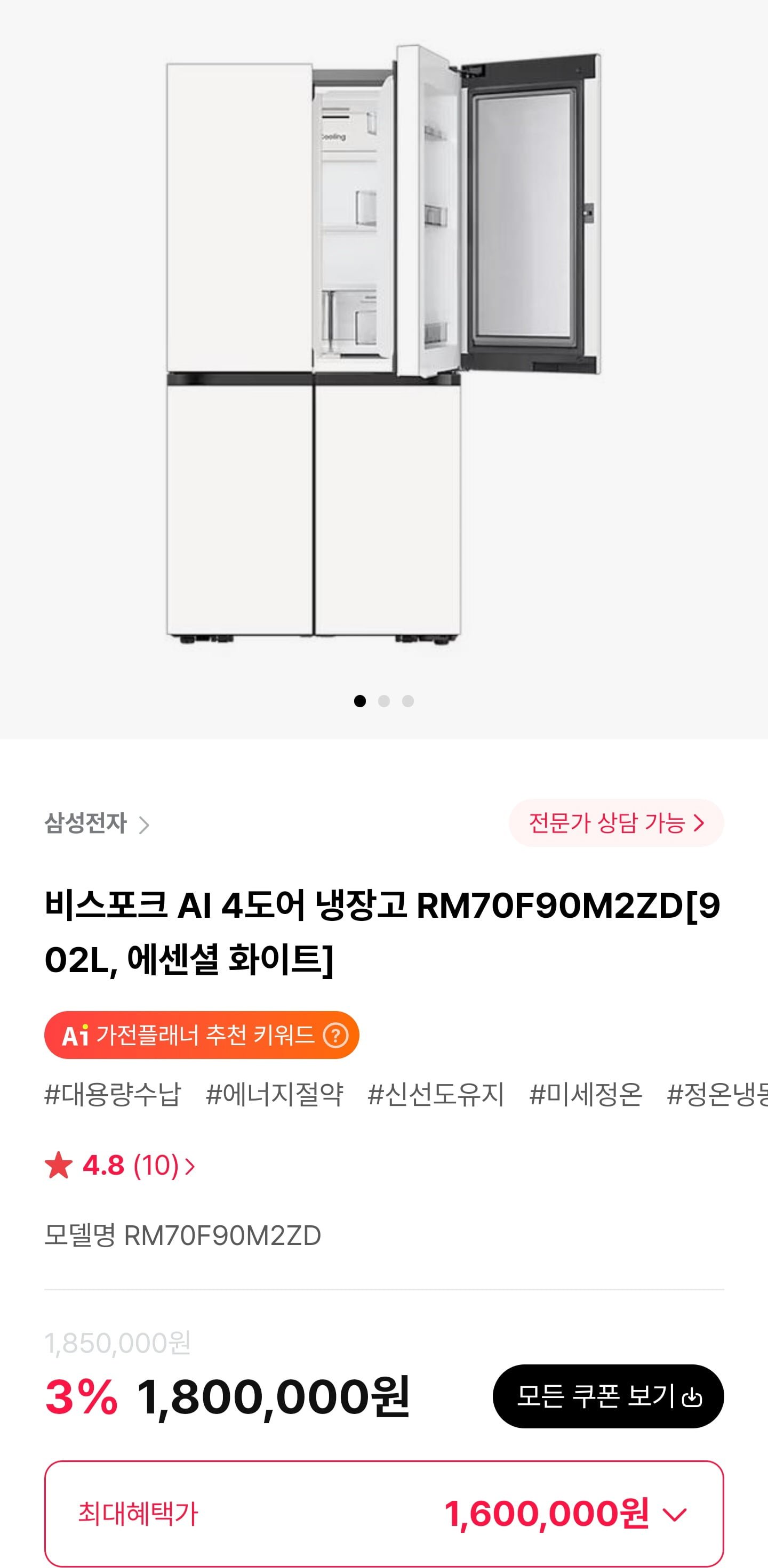 [하이마트몰]삼성 비스포크 AI 4도어 냉장고 RM70F90M2ZD 902L, 에센셜 화이트 (1,600,000원/무료)뽐뿌·6일 전·1,600,000원👍 1💬 1전자IT하이마트몰원문 보기 →