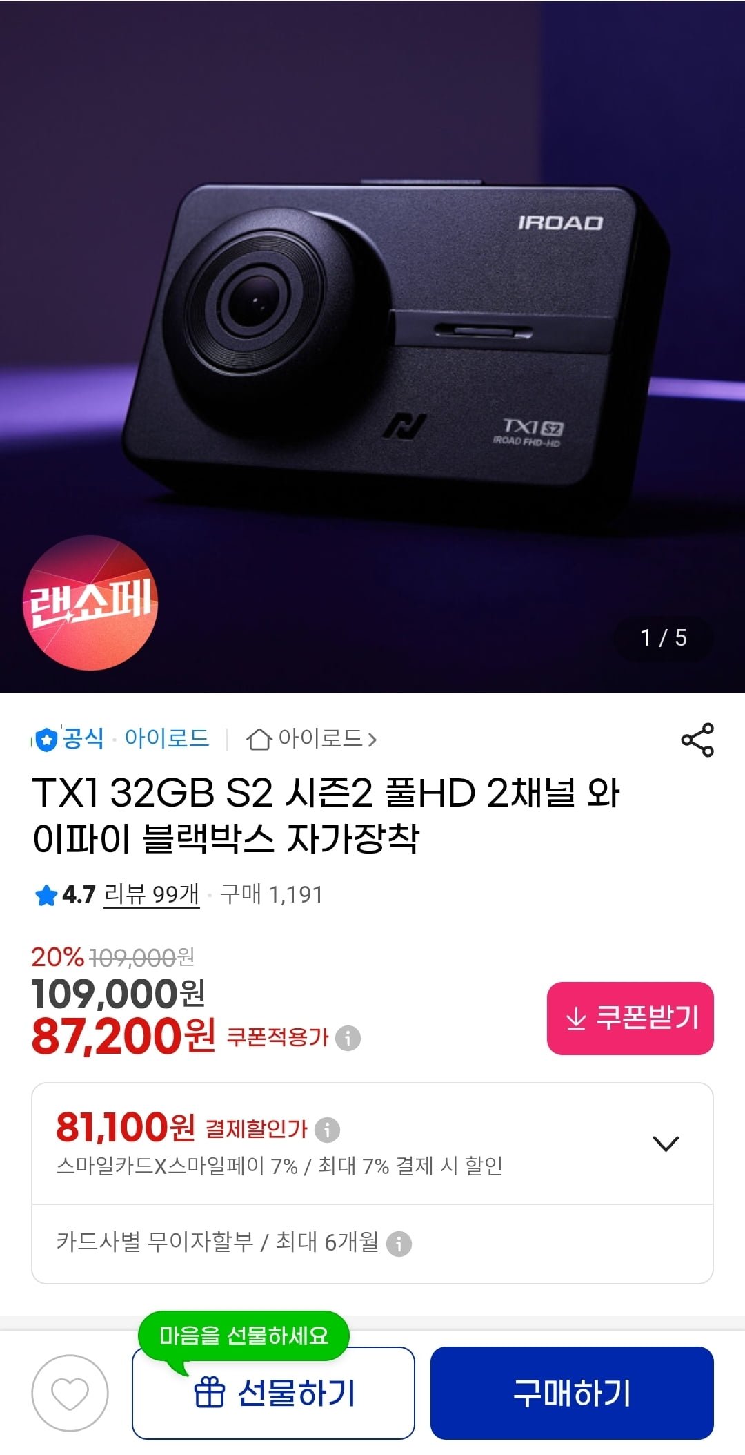 [지마켓]TX1 32GB S2 시즌2 풀HD 2채널 와이파이 블랙박스(81,100원/무배)