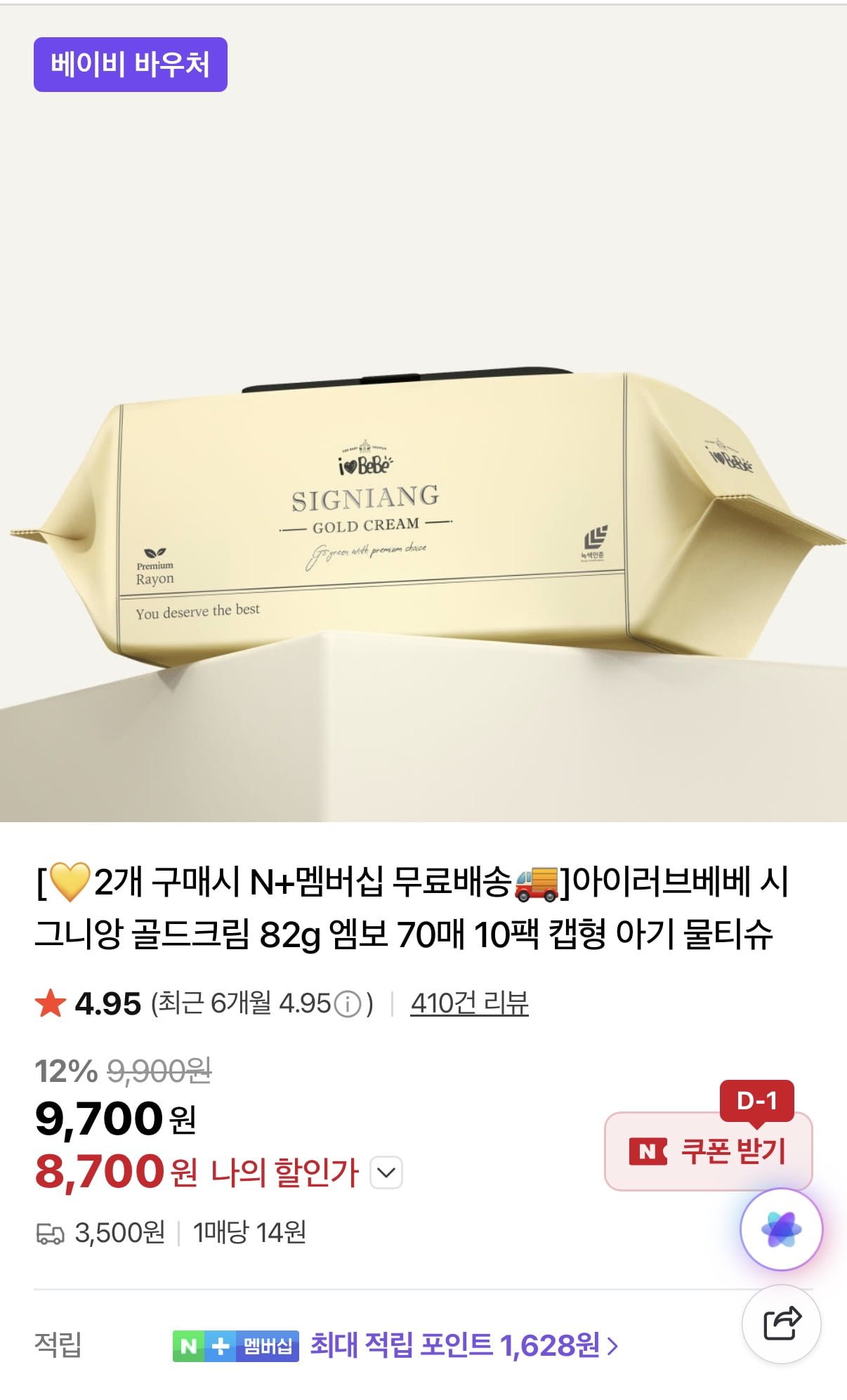 [네이버]아이러브베베 시그니앙 골드크림 82g 물티슈 70매 10팩+10팩 (18,400원/네멤무배) - 딜모아