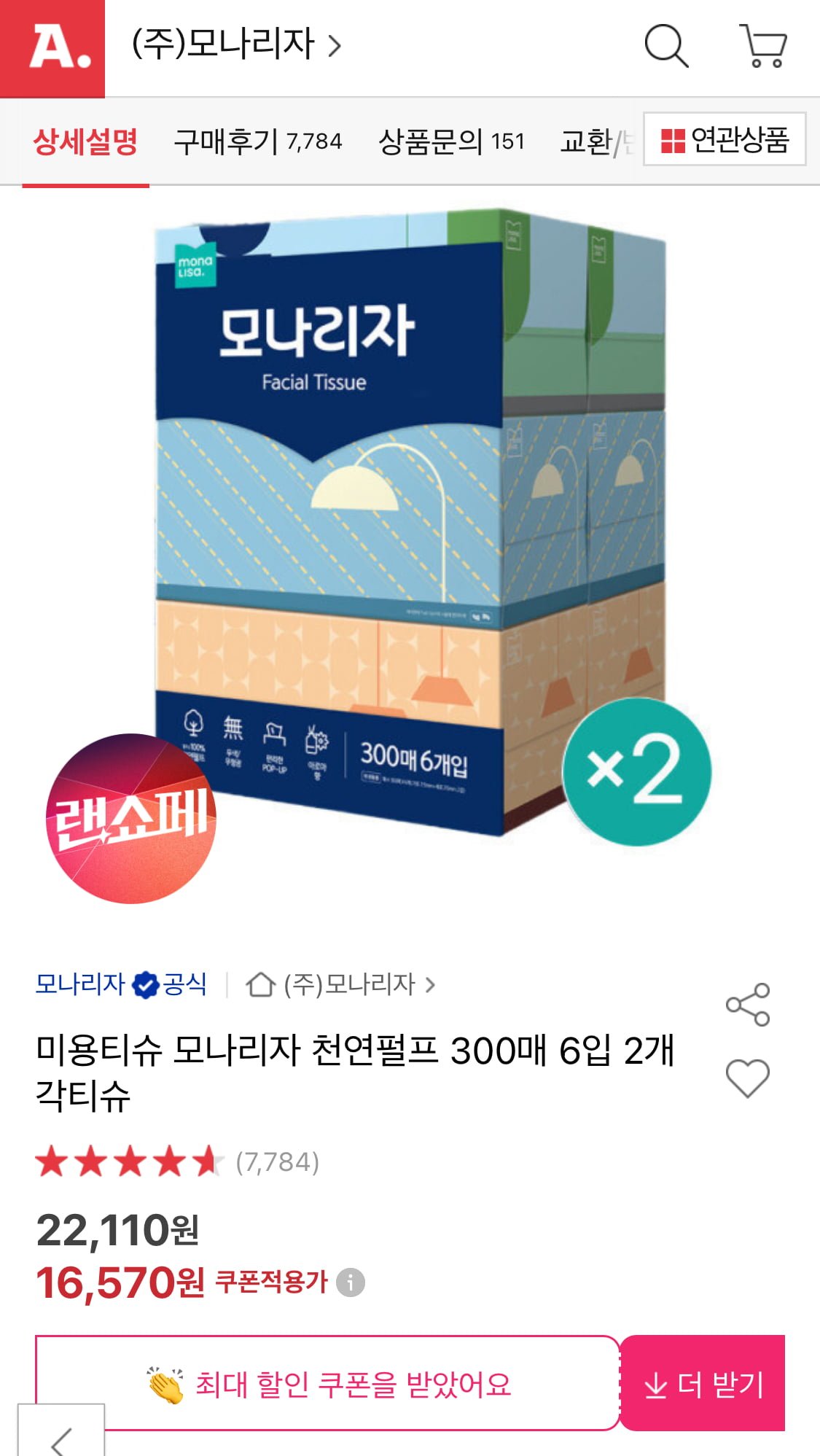[옥션]모나리자 천연펄프 각티슈 300매 6입 2개 총 12개 (유클 16,570원/무료)