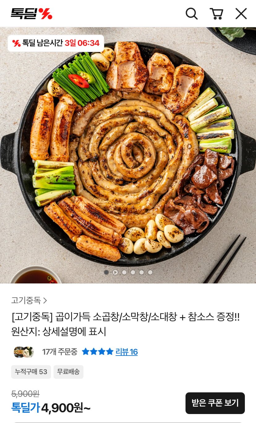 [톡딜]소곱창 160G / 소막창 200G / 소대창 200G (4,900원~/무료)
