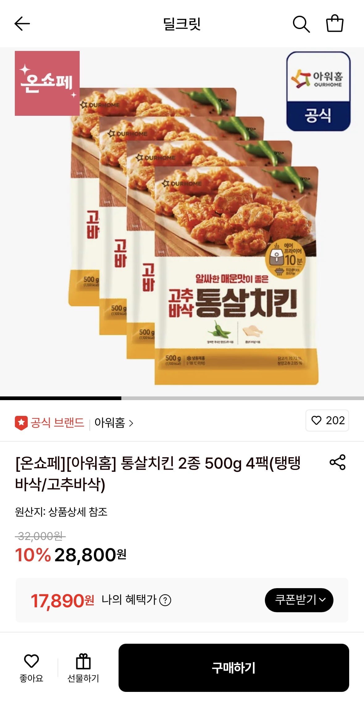 [롯데온]아워홈 통살치킨 500G 2봉+2봉 (17,890원/무료) - 딜모아