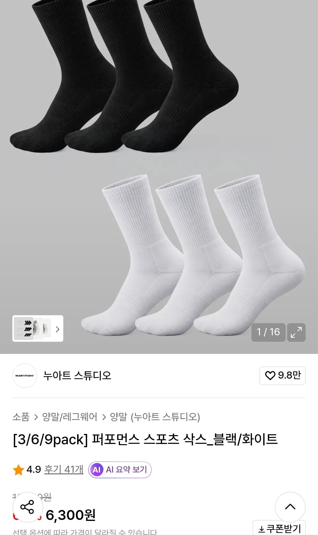 [무신사]퍼포먼스 스포츠 삭스 블랙/화이트 3/6/9 pack (6,300원~/무료)