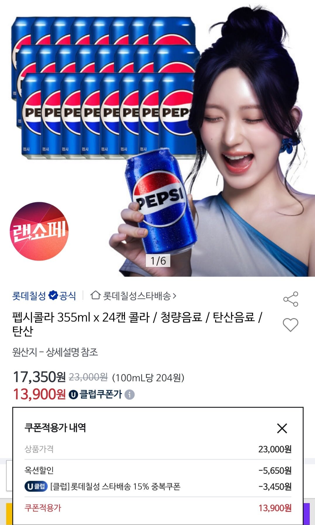 옥션)펩시콜라 355ml x 24캔 (12,920,무배) - 딜모아